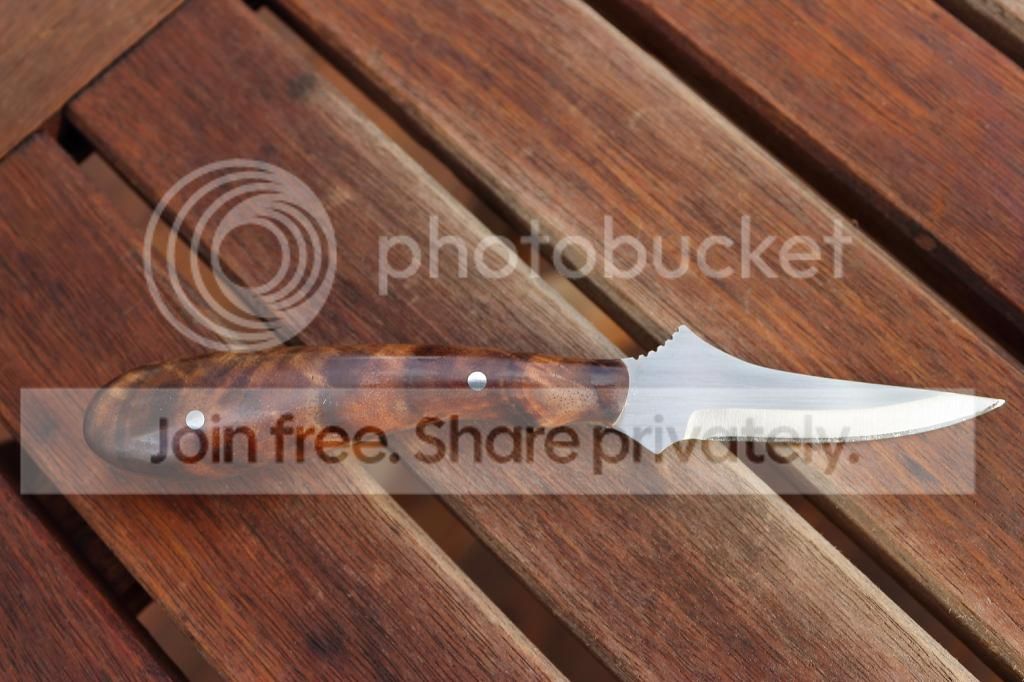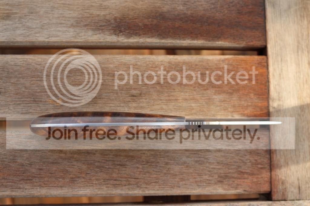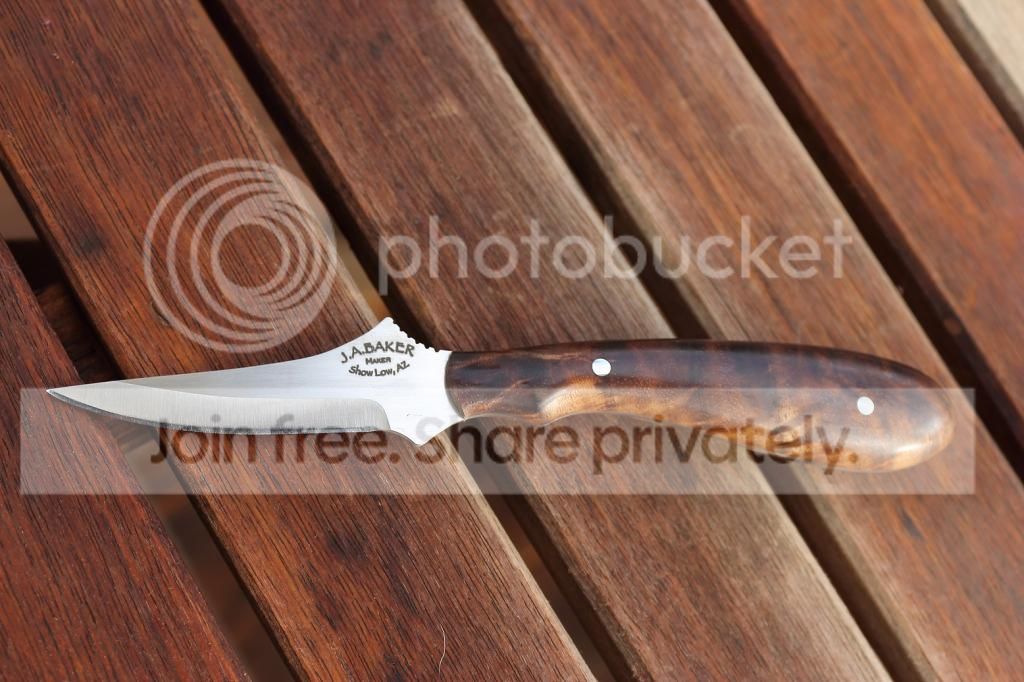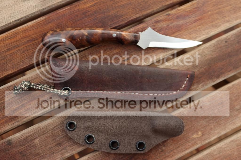I did another small batch of these for custom orders and made one extra to list here. This one is in ATS34 and has a set of highly figured walnut scales. This design works really well for detailed caping tasks and can be held like a pencil for really accurate control. It is very lightweight and designed to be attached inside a pack or bag until needed. This one comes standard with a Kydex sheath. A leather sheath like the one in the photo can be ordered instead for 10.00 additional. Thanks for looking, Jeff