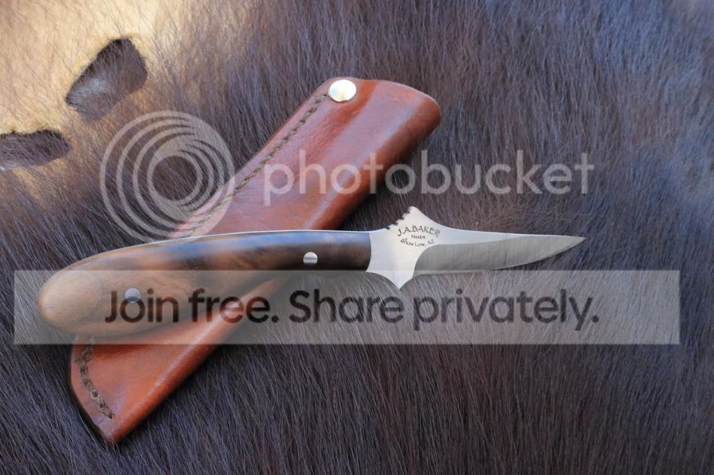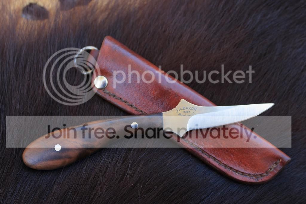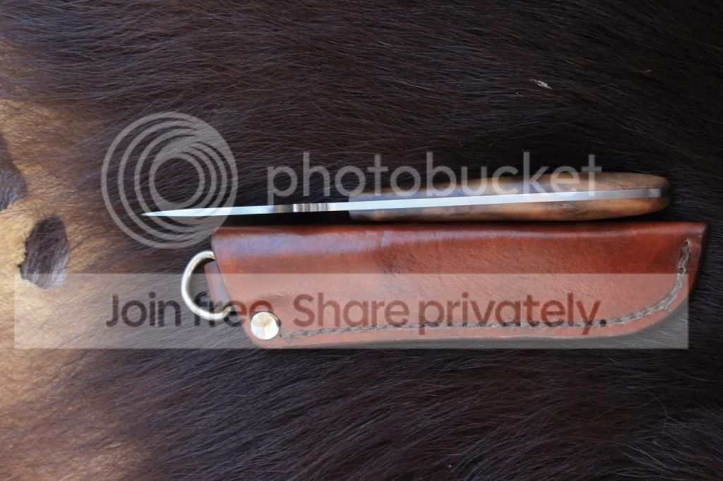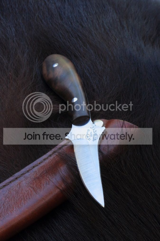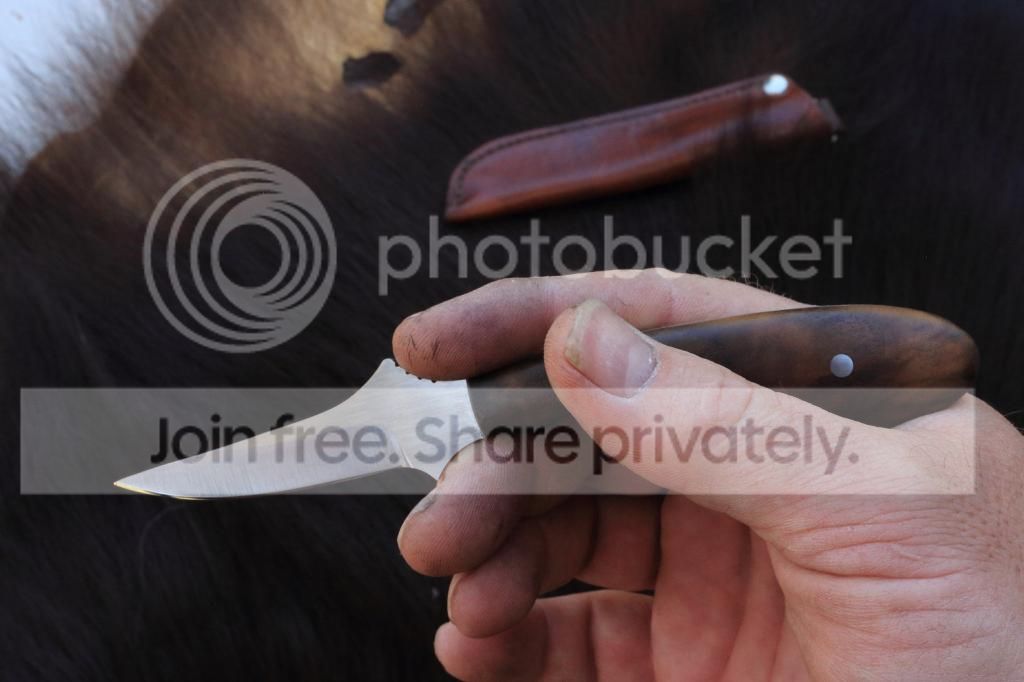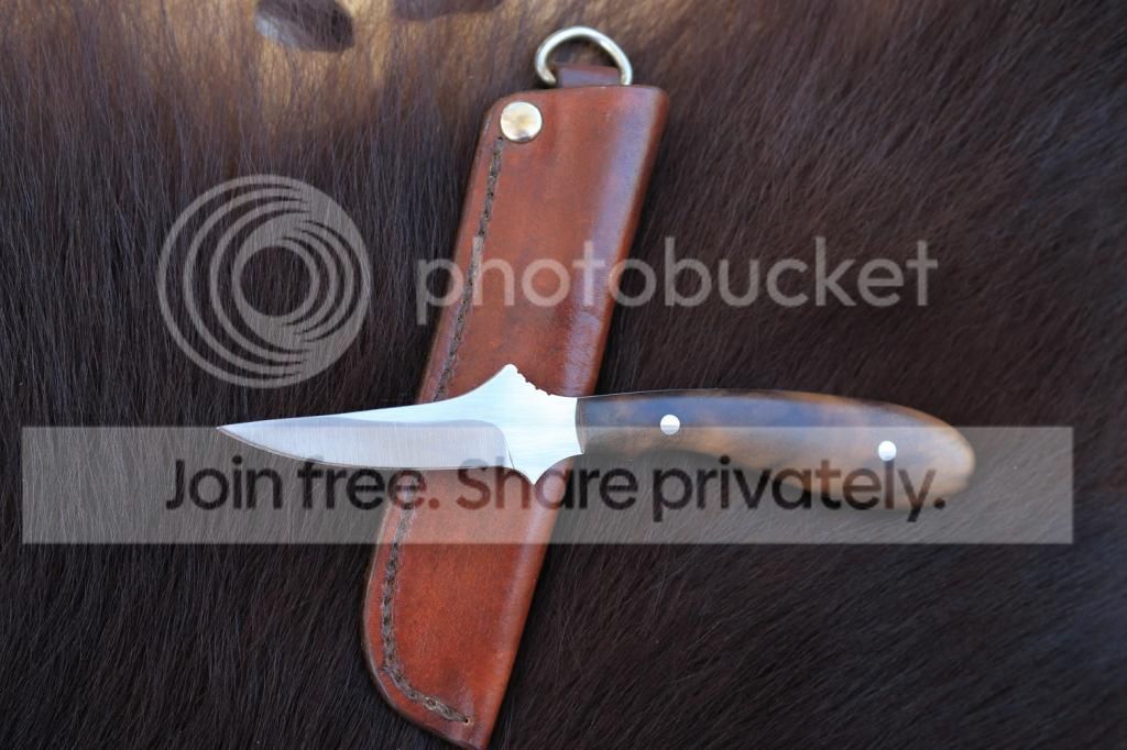 I have got an Ergo Caper up for sale today. I made a batch of these for some local hunters. It is by no means meant to be beautiful. It is a completely utilitarian piece. The knife has been designed to be able to be held like a pencil for detail work as well as conventionally. It is 1095 steel and has figured black walnut scales. It comes with a lightweight leather sheath that has a d-ring for pack attachment. Thank you for looking, Jeff