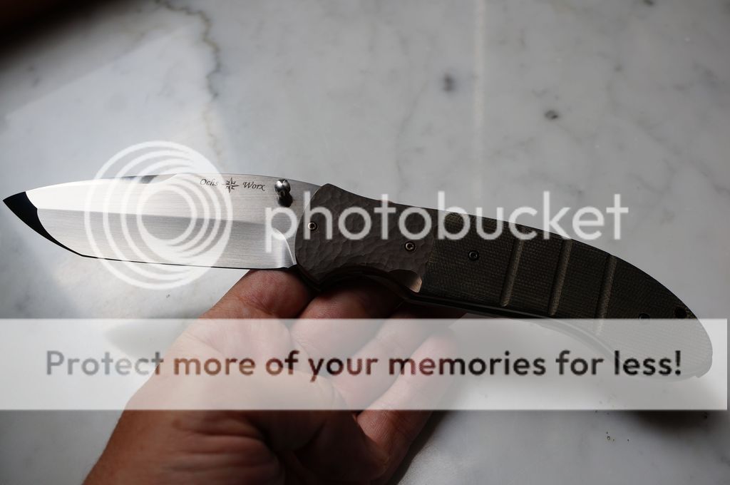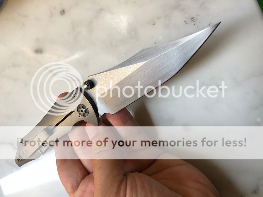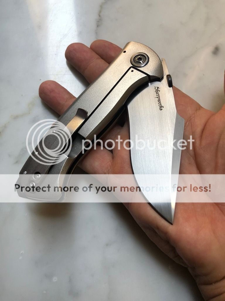 David SharpTryfer framelock, handrubbed blade 3.6”, orangepeel finish on titanium, zirconium backspacer, thumbdisk and pivot collar. Strong detent and amazing action. Purchased from a dealer, mint condition, asking $ 1300 + paypal fees