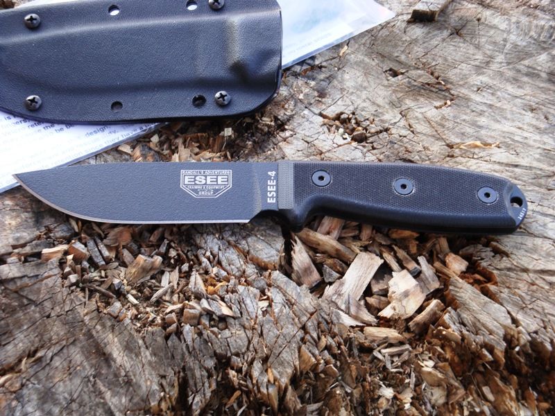 First I have a new, unused ESEE 4, black with black G10 handles. This one is a beauty and tough to find with the factory black G10 handles. Includes the factory kydex sheath, boot clip and instructions. ---SOLD---