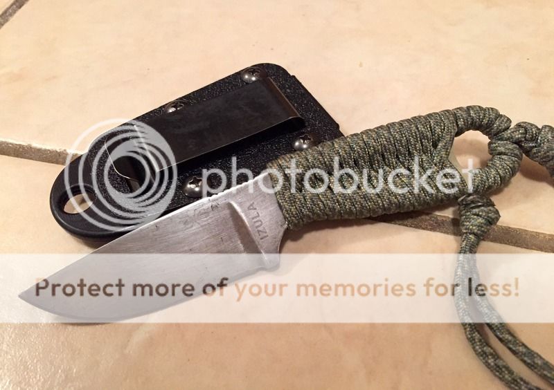 First is an ESEE Izula. Originally tan, the blade has been stripped and has a natural patina. Cord wrapped handle, sheath and belt clip included. $45 shipped