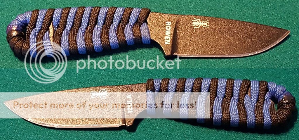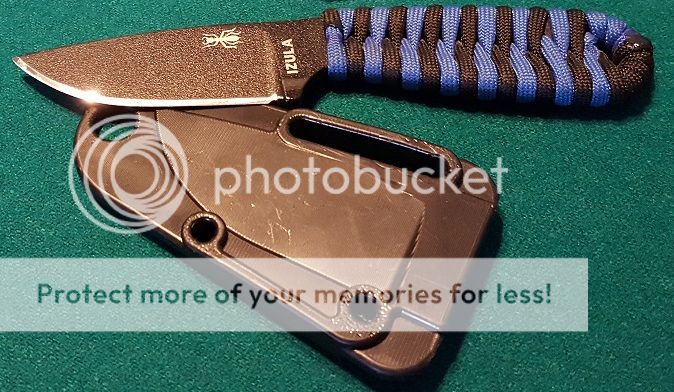 Black Izula with paracord wrap, sheath and clip. Used but not abused. Has 1 small mark in coating which isn't all the way through the coating. Sharpened with an Edge Pro. Really like the knife but it's been replaced with a Stainless Izula. That, and I've got another project to fund.