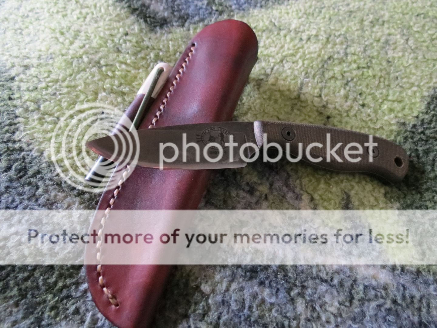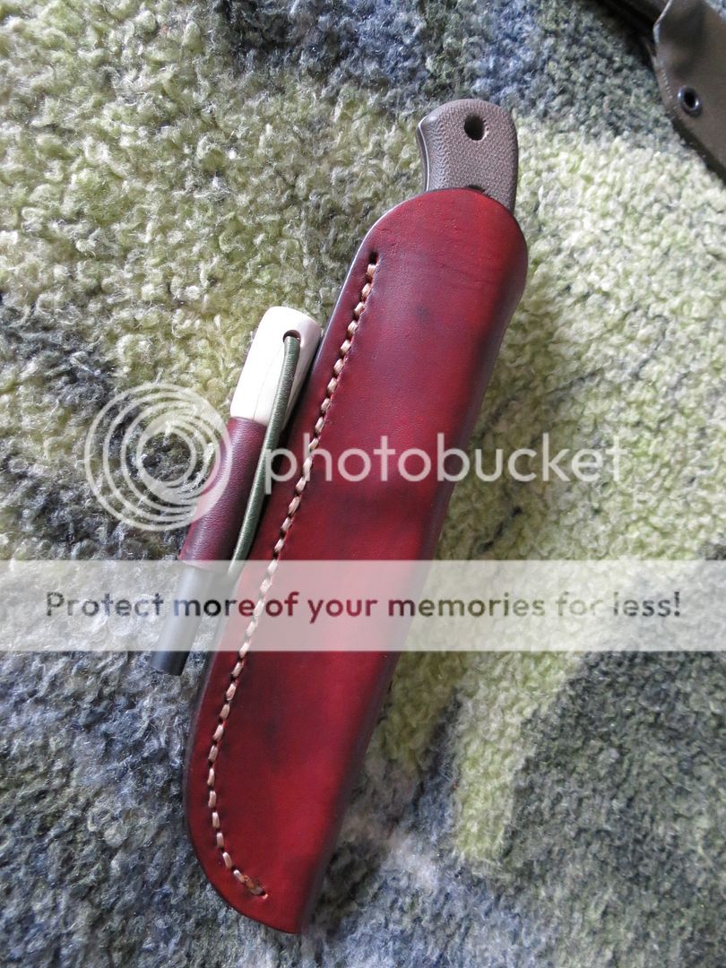 The sheath was made by myself out of 9/10 oz veg tan, finished with dark brown dye, neatsfoot oil and Sno-Seal. Sewed up with artificial sinew, and it has a loop fit for an army size ferro rod.