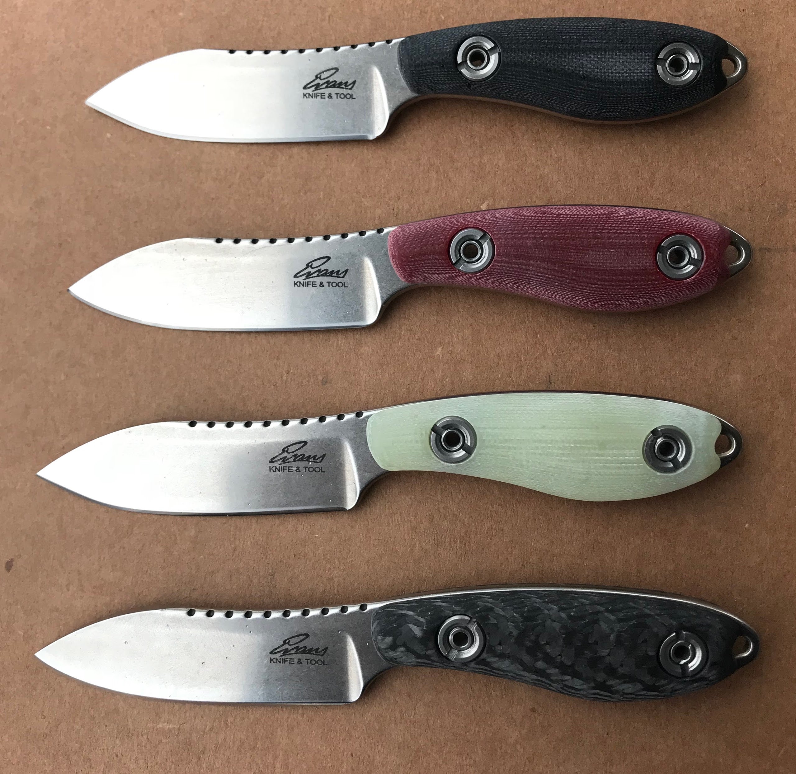I have 22 knives remaining. I have a combination of 16 carbon fiber, 17 jade, 1 black g10 and 4 red g10 scales left. Whatever 22 sell first is how it will go. If you want an extra set of scales, let me know your preference, and if any are left when the knives are gone, I will let you know.