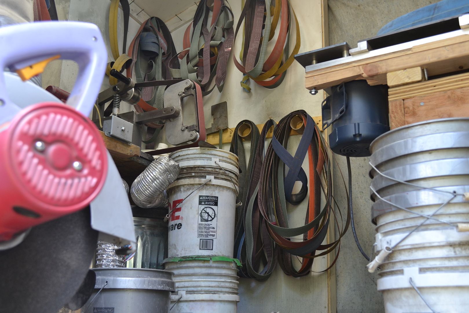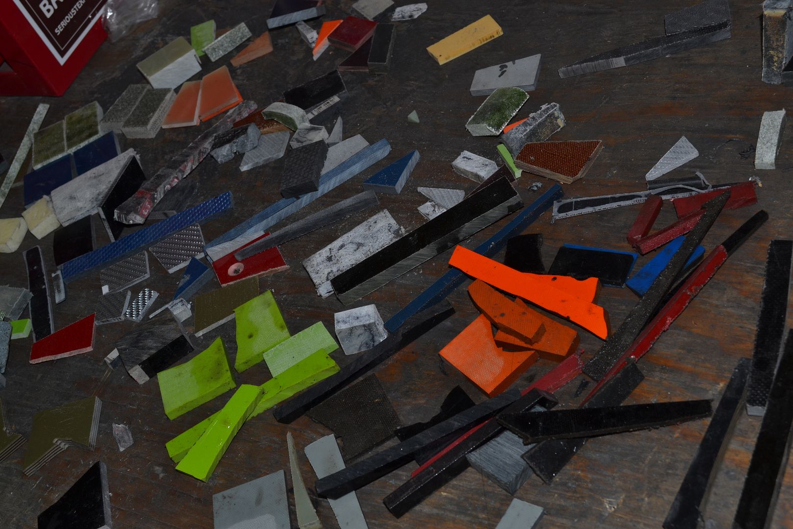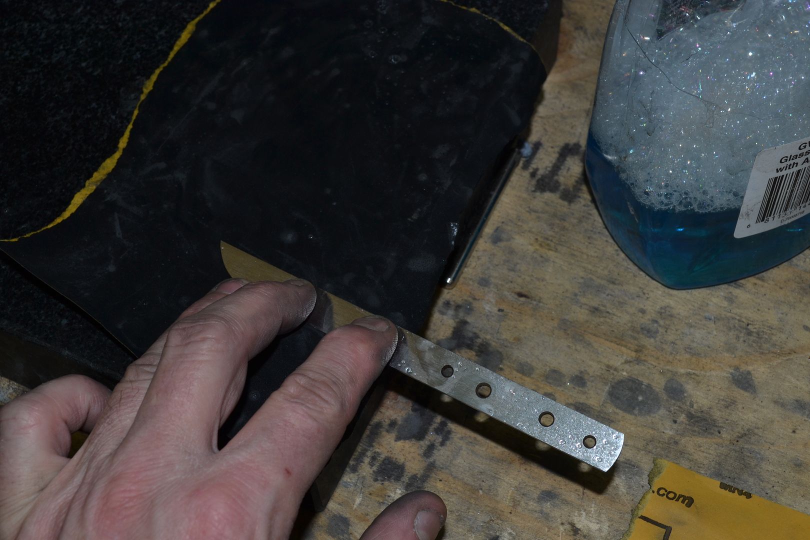 Hand sanding setup - granite surface plate, windex, sandpaper... gets a flat grind very flat! I'm also using stones on some for finishing.