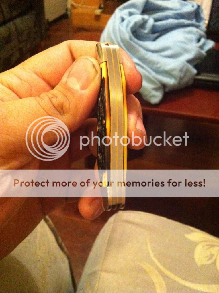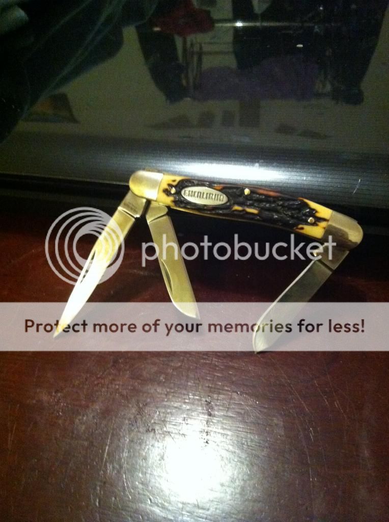 Well not exactly, his was an old Schrade with stag handles, this one is made by an outfit called Excalibur and it's handles are plastic renditions of stag. When I saw it I thought I'd have a look, it was priced at $15 so i didn't expect much. Funnily enough it was brilliant, no blade play, sharp as anything, no gaps near the springs, fully peened brass pins. The blades were good, only one had a minor kink in it and though I'm not sure the steel will hold up over the long run the starting edge is better than fair.