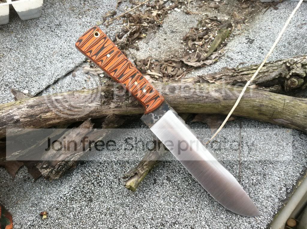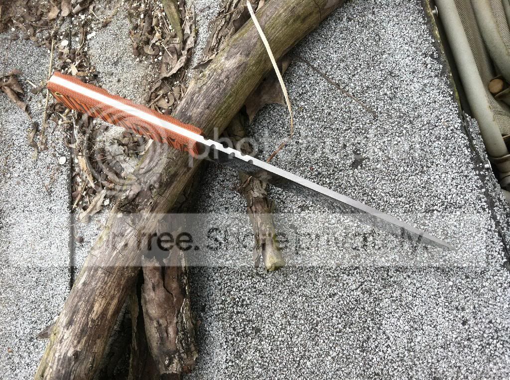 Scales: Black/Orange G10. Fixed with Brass pins and lanyard hole andWest Systems epoxy. Sculpted for retention, though not overly aggressive so as to fatigue your hand or become uncomfortable.