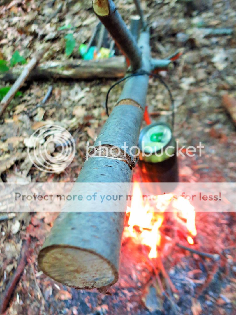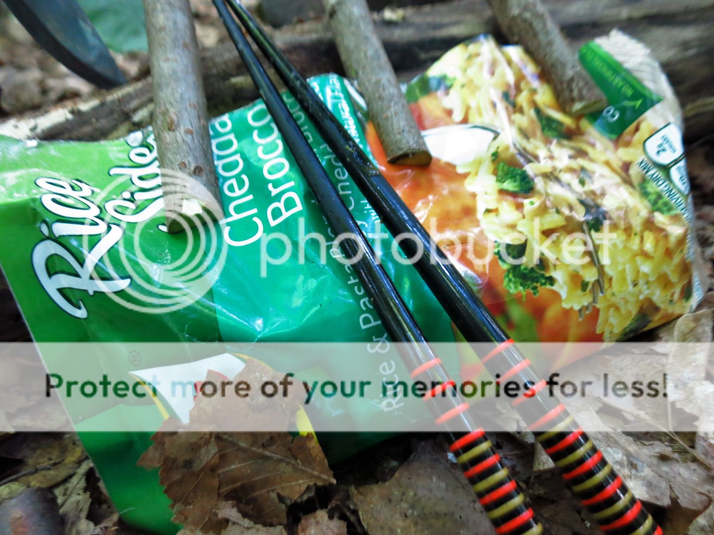 The split wood pegs will clamp the package closed to keep in the heat while it rehydrates the rice. Light batoning with the knife after sawing the green wood was all it took for this little trick. It can also be used to secure tarps, plastic and space blankets to a ridgeline.