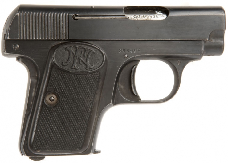 It says FABRICATION FRANCAISE CAL 6.35 on the slide. (6.35mm is the same as .25ACP.) The left grip says KITU in a kind of psychedelic script (I can probably get a better picture of that if I mess around with lighting a little more.) The right grip says MFB.