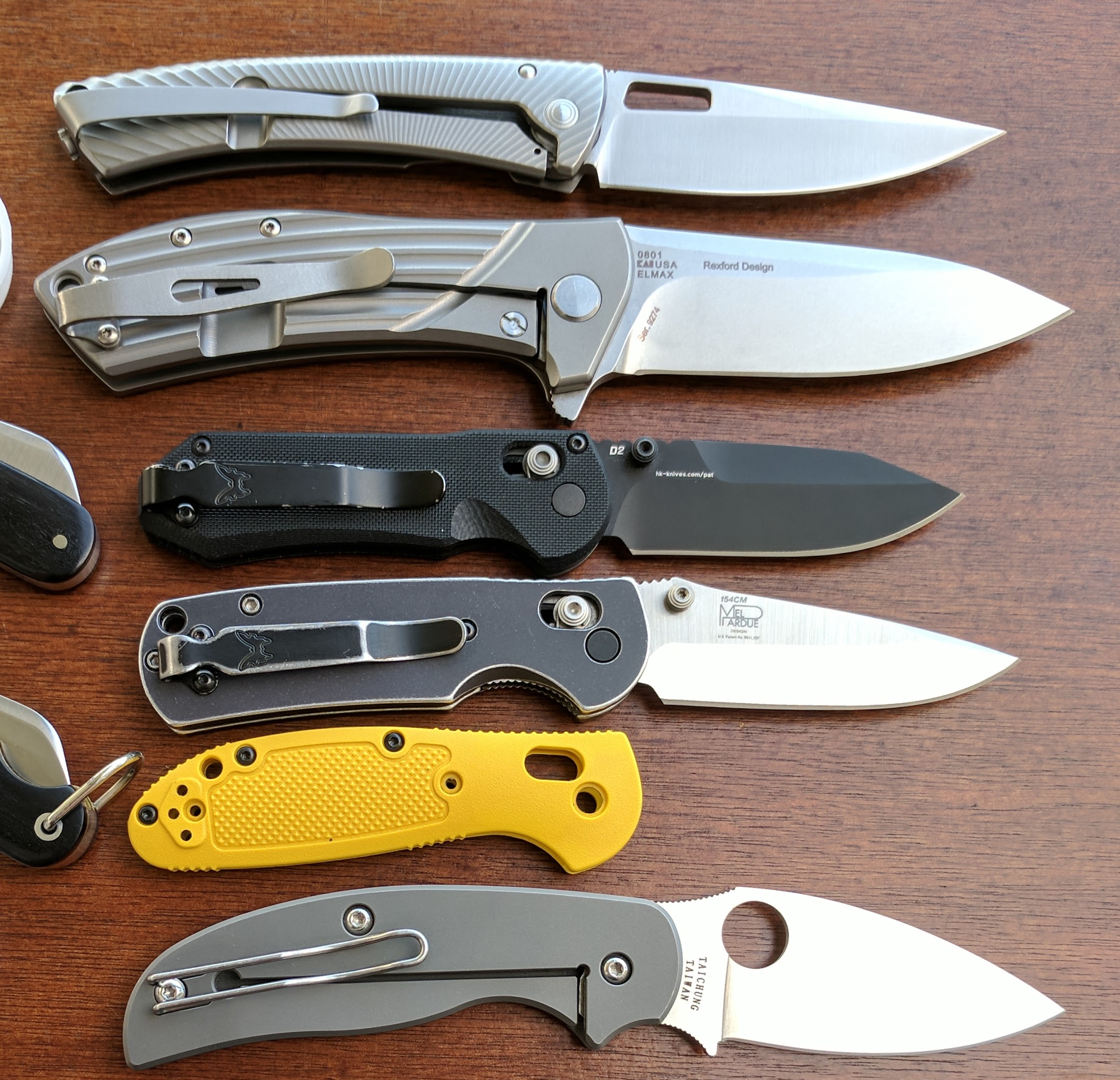 -Benchmade Mini grip w/ AWT scales- $SOLD scales are unique distressed dark grey from a limited run a while ago. Pocket clip was distressed to match. Excellent action, could be tightened up a bit to get rid of the tiny blade play, but I prefer it this way, one of my favorite Benchmades. Used, but shows very little. Hairpopping sharp & centered. Comes with original yellow scales, unused clip, some extra screws and pivot screw, baggie and box.