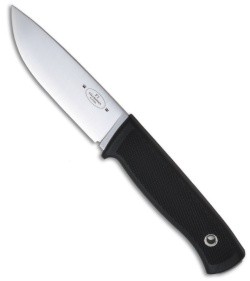 Fallkniven F1 Swedish Military Survival Knife. 8 1/4" overall. 3 3/4" laminate VG-10 stainless drop point blade with brushed stainless finish. Black checkered Thermorun elastomer handle with visible tang end and lanyard hole. Carried by the Swedish National Defense. Full cover black leather belt sheath. $130