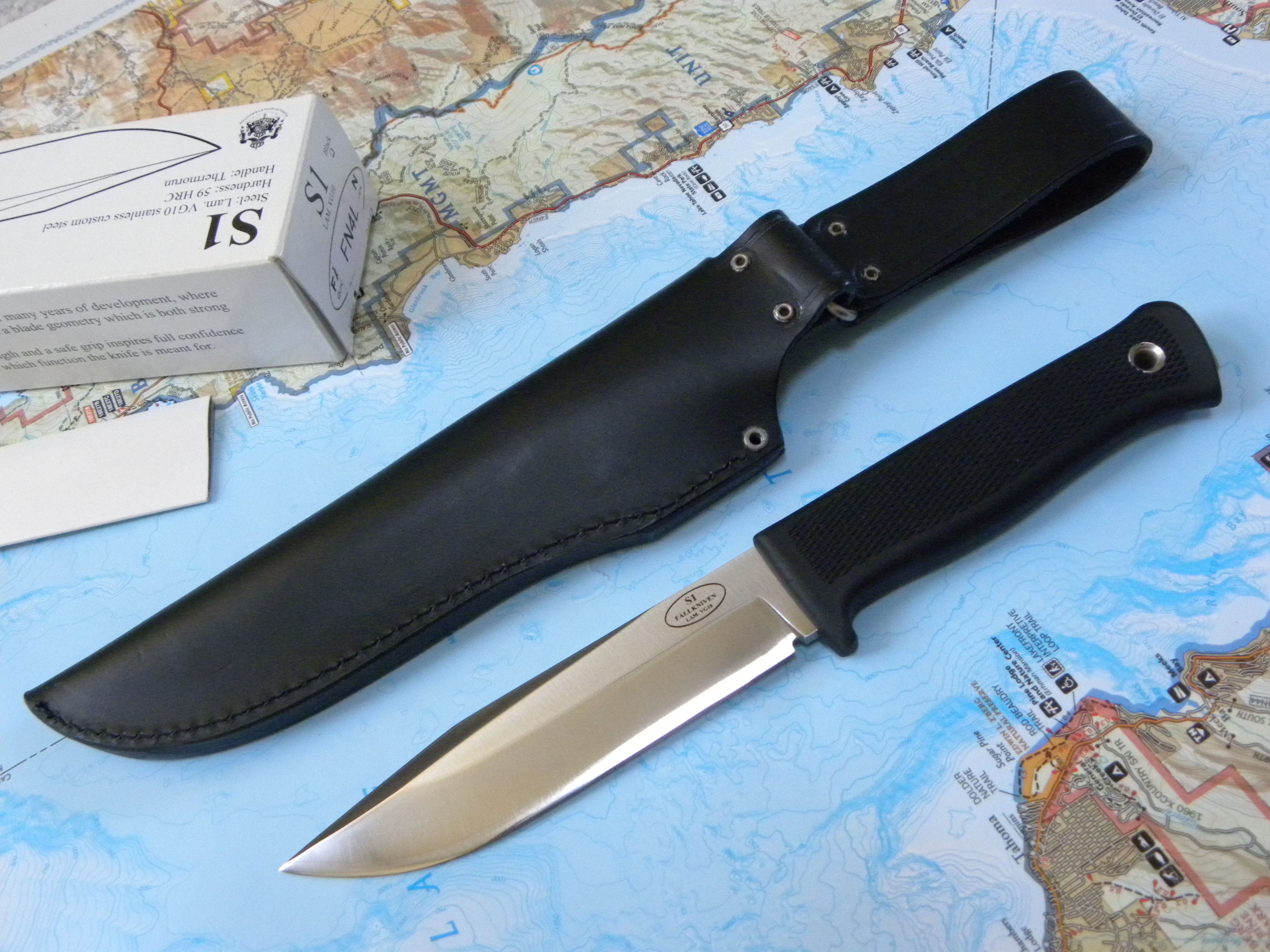 For sale is a Fallkniven S1 in VG10 steel. This has remained in unused condition. Includes black leather sheath with dangler attachment and box. Specs are below.