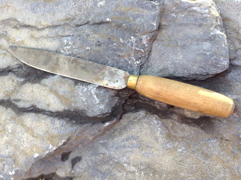 This past weekend, I opened up my uncle's summer camp for him and found these 3 in the drawer and thought I'd post some pictures of them for your interest. They're rather simple, straight-forward knives. Simple hidden tang construction in plain, turned wood handles. Flat, somewhat convexed blades of carbon steel. As you might expect, they sharpen up wonderfully and slice well. I imagine that at some point these will get pulled from service, but there's something really wonderful about using a knife made by your kin folk well over a 100 years ago. It's something that runs deep.