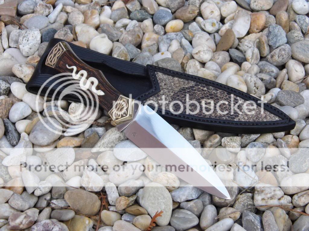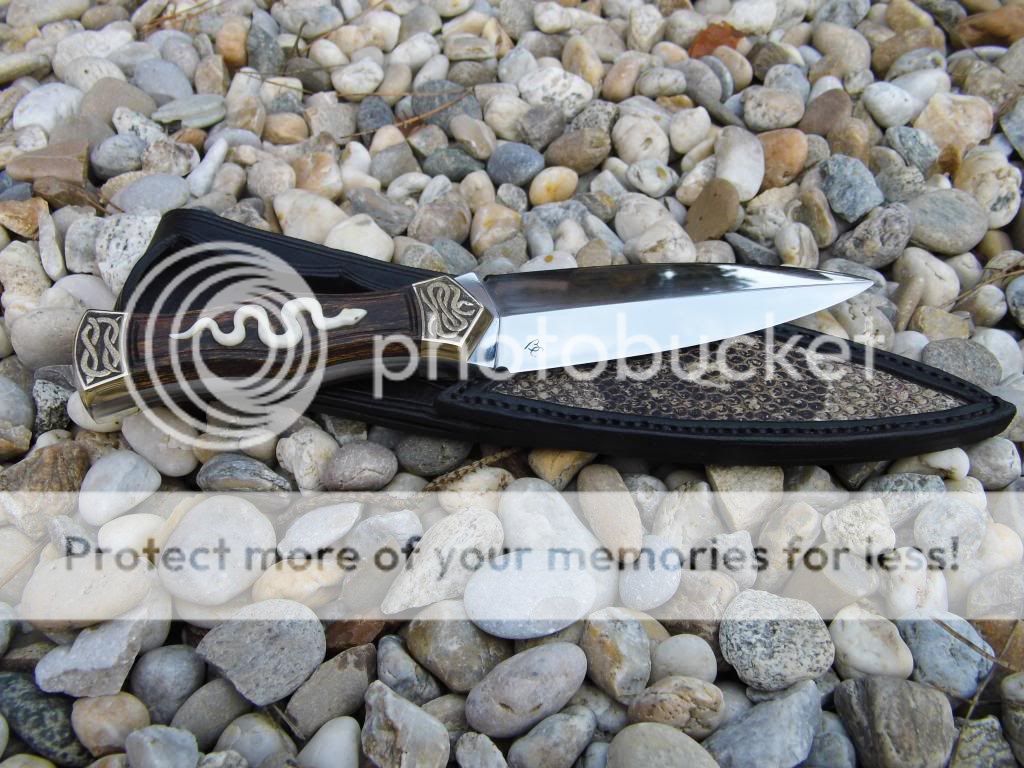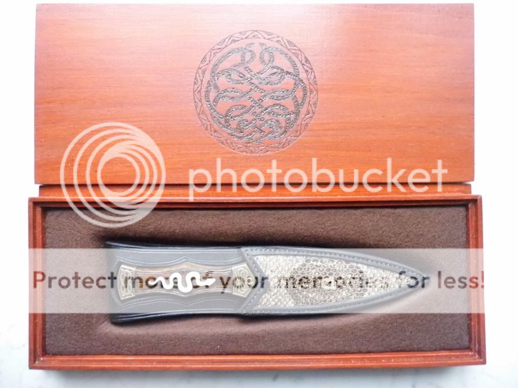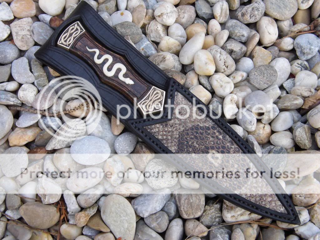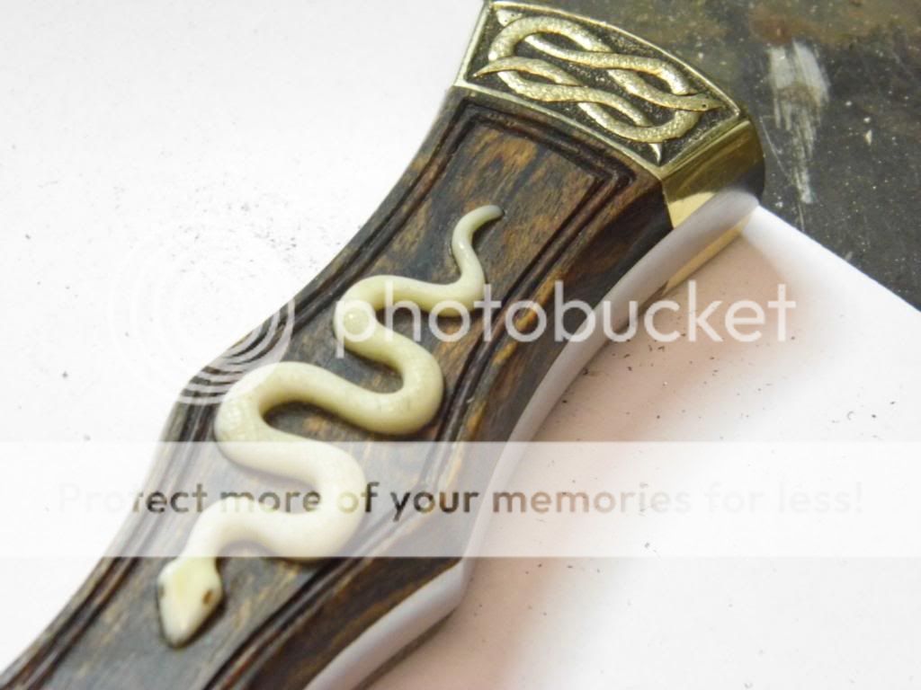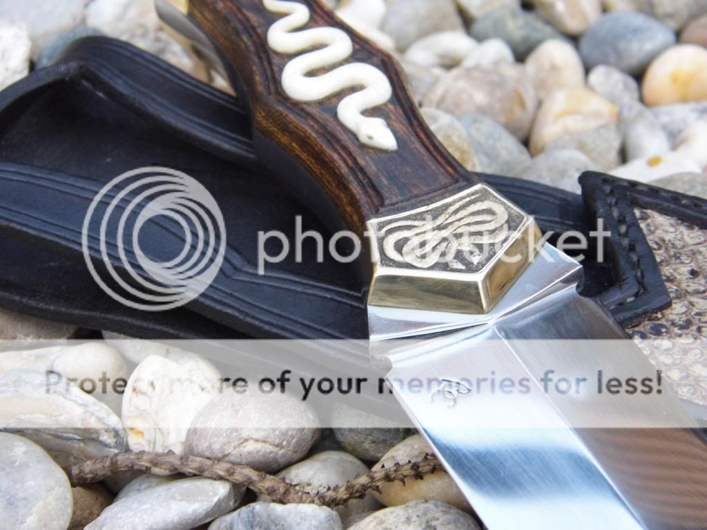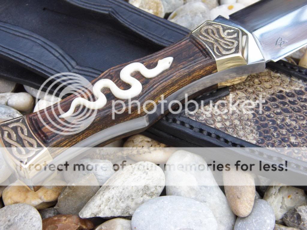 O/A 240 mm(9.5 ") ,Blade 120 mm (4 1/4"), full tang/hidden pins construction,52100 (ballbearing steel) ,beautifully balanced and razor sharp...hand carved bronze bolsters, hand checkered Bocote handles inlayed on one side with hand carved Warthog Ivory snake and on the other with sterling Silver plate for monogram/initials ...leather sheath with snakeskin insert ,comes with case and signed COA ,sole maker yours truly and as usual,100% handmade and one of a kind