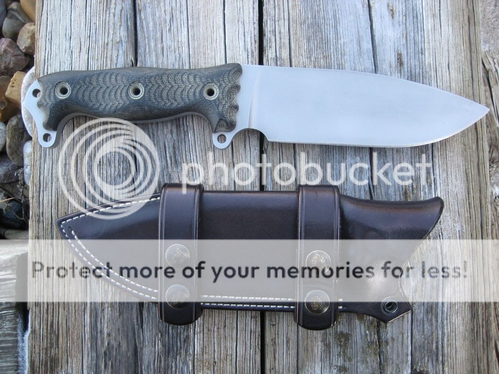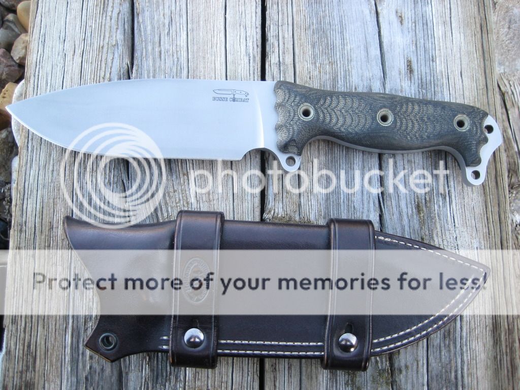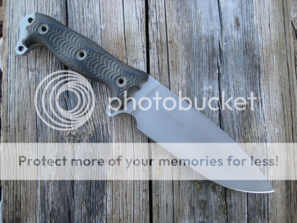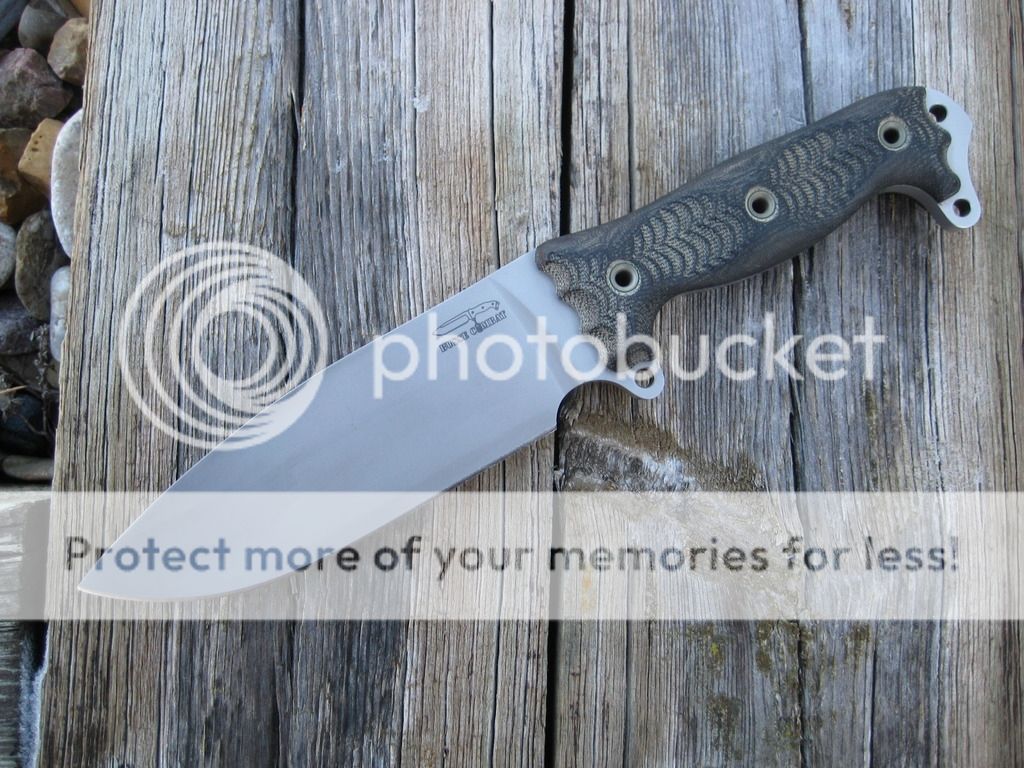 Fat ASH-1 in Double Cut finish with black canvas micarta handles. Unused and unsharpened. Some light discoloration in the DC from going in and out of Holloman black leather sheath. Price is $525. SOLD
