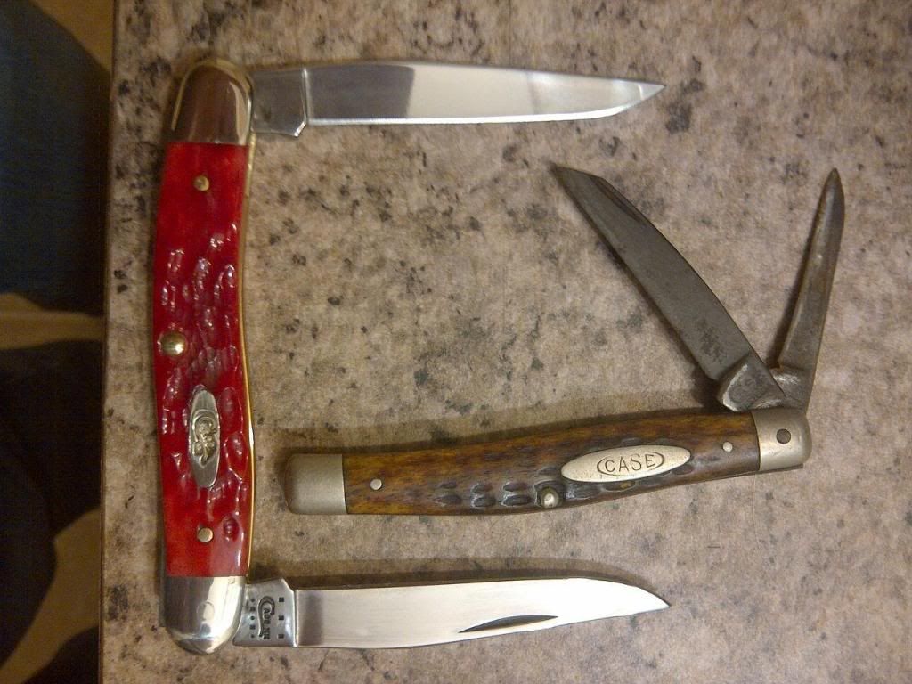From left to right: a Schrade Uncle Henry, the middle one I'm not sure but one blade says Western, the last is a Buck stockman. I'm really not sure of the ages. I have several more of his knives stored, a few old timers. He stopped using them I suppose because the blade were broken, or sharpened heavily like the middle knife shown.