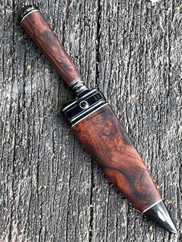 Hello friends, back again! I'm showing you this recently finished piece: a gaucho knife made of Damascus steel with a feather pattern. It's composed of 1070 and 15N20 steels, has a 5.5" blade, and its total length is 10.25", with a maximum thickness of 0.15". The handle is made of ironwood with blued 5160 steel inserts and silver inlays. The sheath is also made of ironwood, with a blued 5160 steel tip and throat, also featuring 999 silver inlays. This piece took me a lot of time, but I'm very happy with the result. I hope you like it!