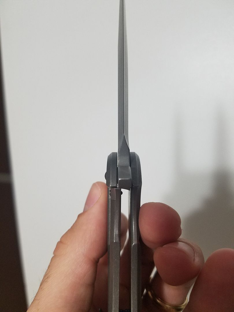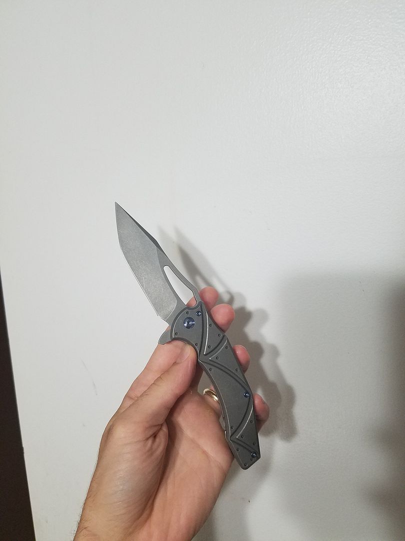The knife features a CPM20CV blade, blue titanium hardware, and "Atlantian Scales." The action is snappy and smooth. The blade is perfectly centered. The lockup is early and solid as a bank vault. I am asking $475 --> $450 -->$425 OBRO.