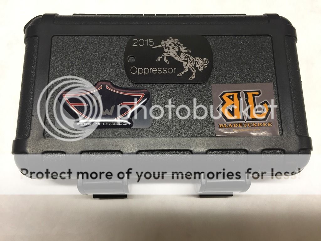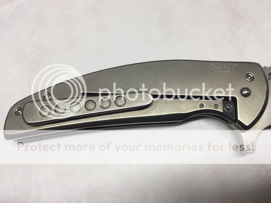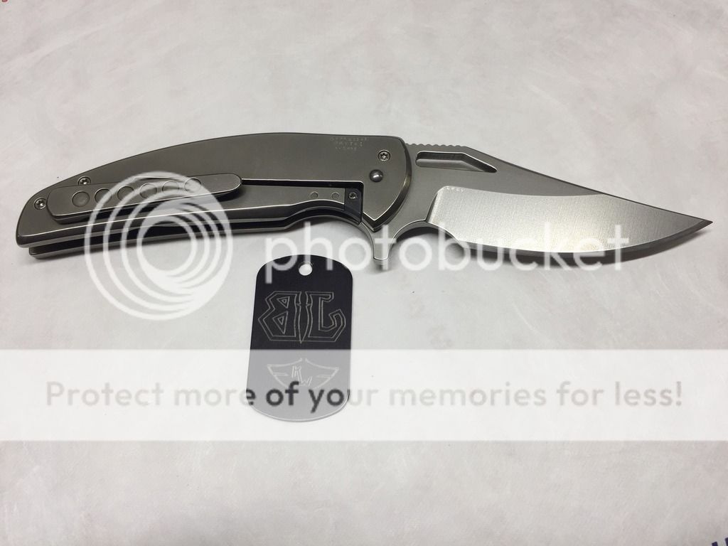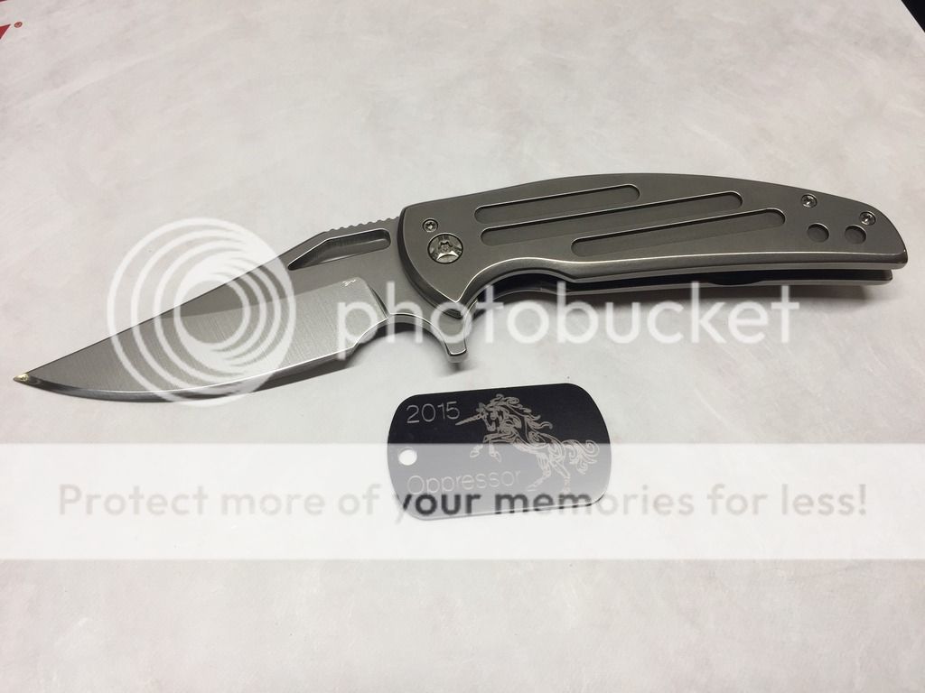 Ferrum Forge Oppressor Prototype one off. This was designed by Scott from Bladejunkee. It was his personal knife as they used it to finalize the Oppressor design. It has a unique one off finish called the Platinum finish, insanely rare finish, the only Ferrum with this finish to date. It was lightly carried by Scott @ Bladejunkee and has a few tiny marks on it. Original factory edge never sharpened. Rock solid lockup, buttery smooth action, nicely centered & flips like a rocket. Comes with original hard snap case and KW/BJ dog tag.