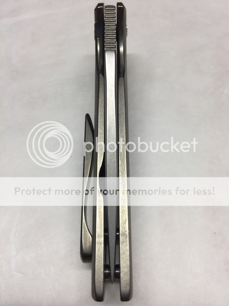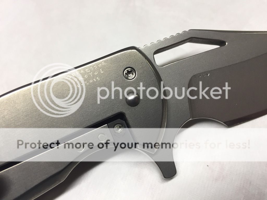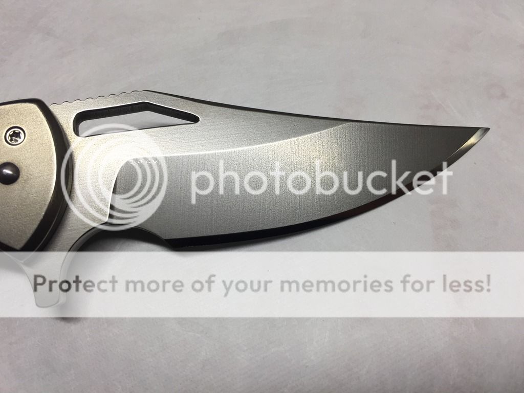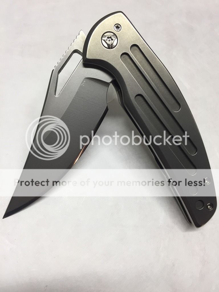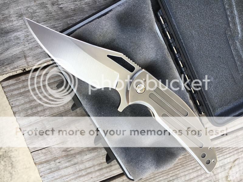 Ferrum Forge Oppressor Prototype one off. This was designed by Scott from Bladejunkee. It was his personal knife as they used it to finalize the Oppressor design. It has a unique one off finish called the Platinum finish, insanely rare finish, the only Ferrum with this finish to date. It was lightly carried by Scott @ Bladejunkee and has a few tiny marks on it. Original factory edge never sharpened. Rock solid lockup, buttery smooth action, nicely centered & flips like a rocket. Comes with original hard snap case and KW/BJ dog tag.
