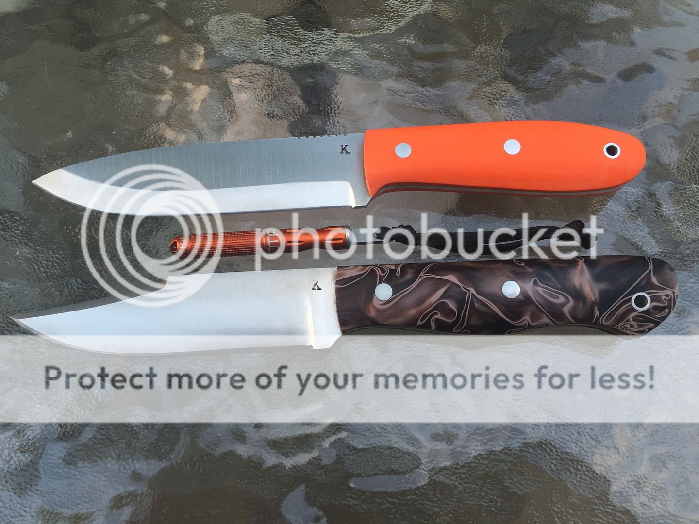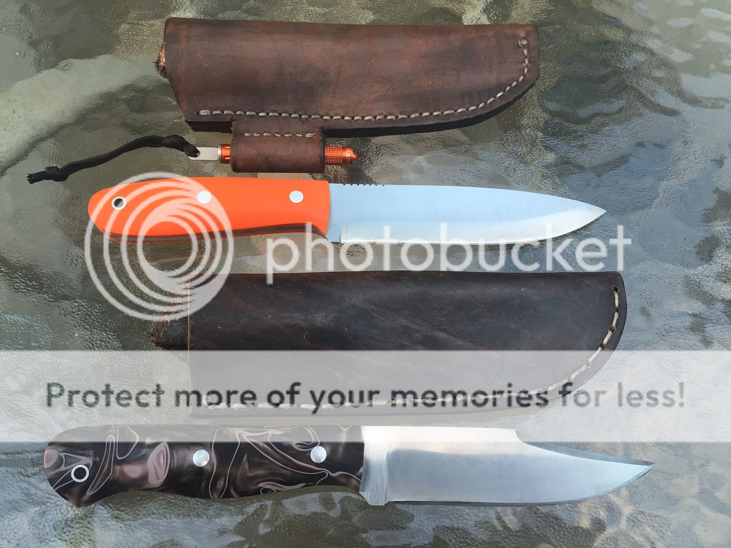 JK one off custom. 1/8" O1, scandivex, jimping, orange g10, leather sheath, excel nano striker fire steel. 9 3/4" overall. Just the nano striker and sheath were $60.