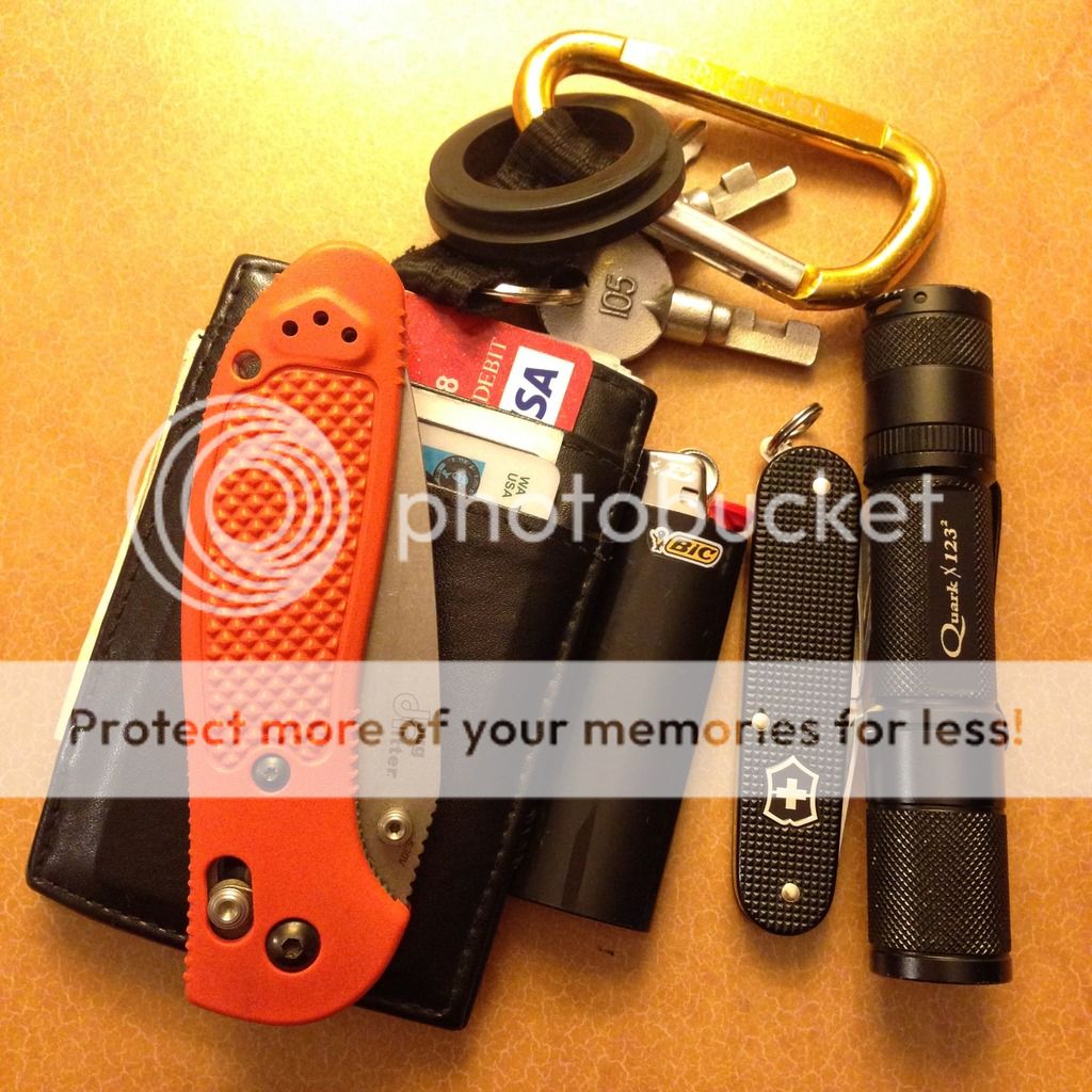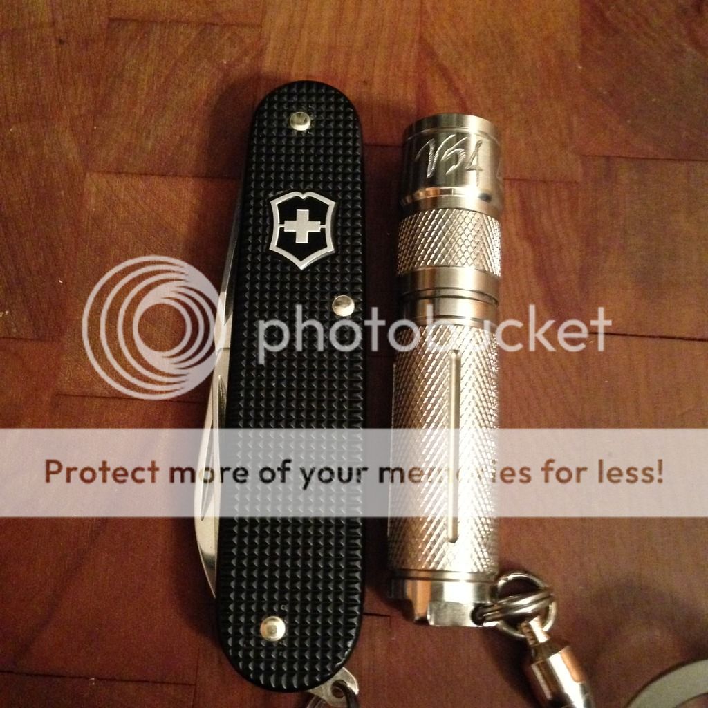 And since I'm still a light whore, I added the Mech Army PT16(little fat light). Its rated at 1000 lumens with one 16340 rechargable lithium battery. I usually avoid the multiple led lights, but this one has 3 leds in the head. I really like this light. It just has a look to it. There is also a neato momentary full blast feature. Hold down the button and it shines full power. Release the button and its gone. So you can have the light set to turn on in the dimmest mode and still jump directly to a momentary full blast. I like that.