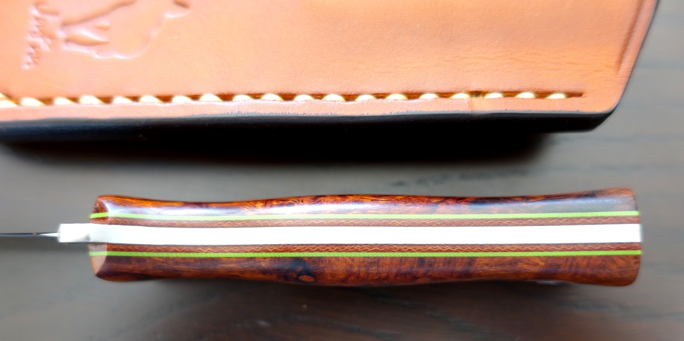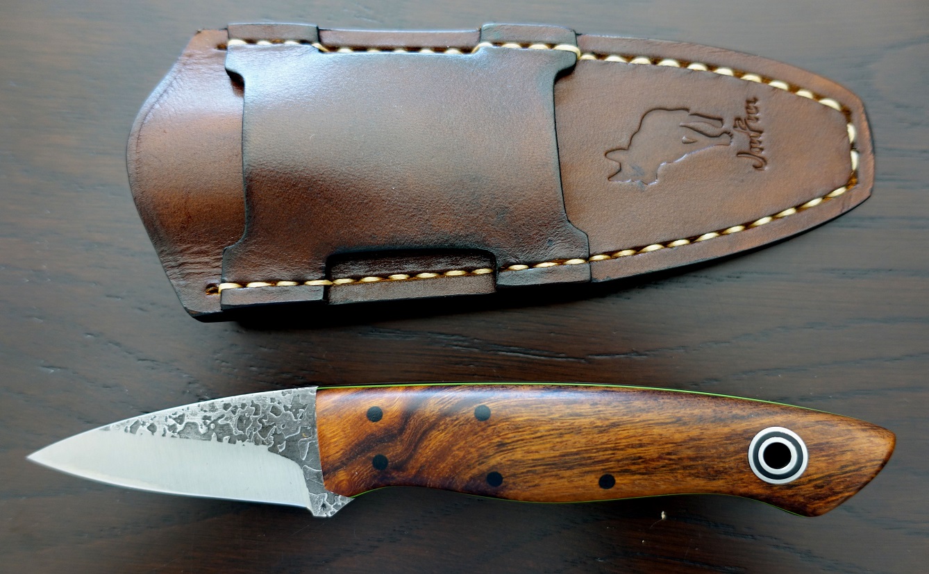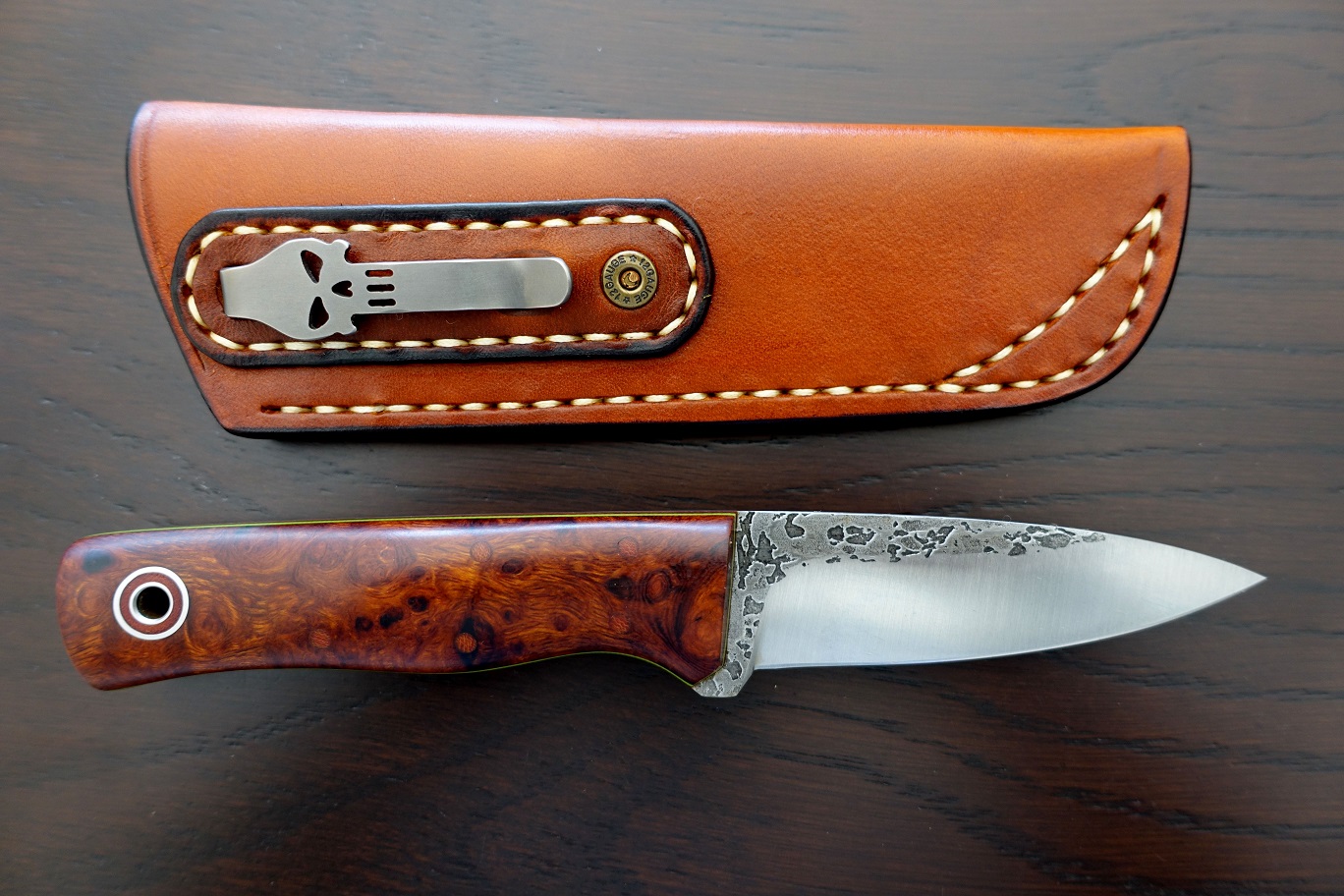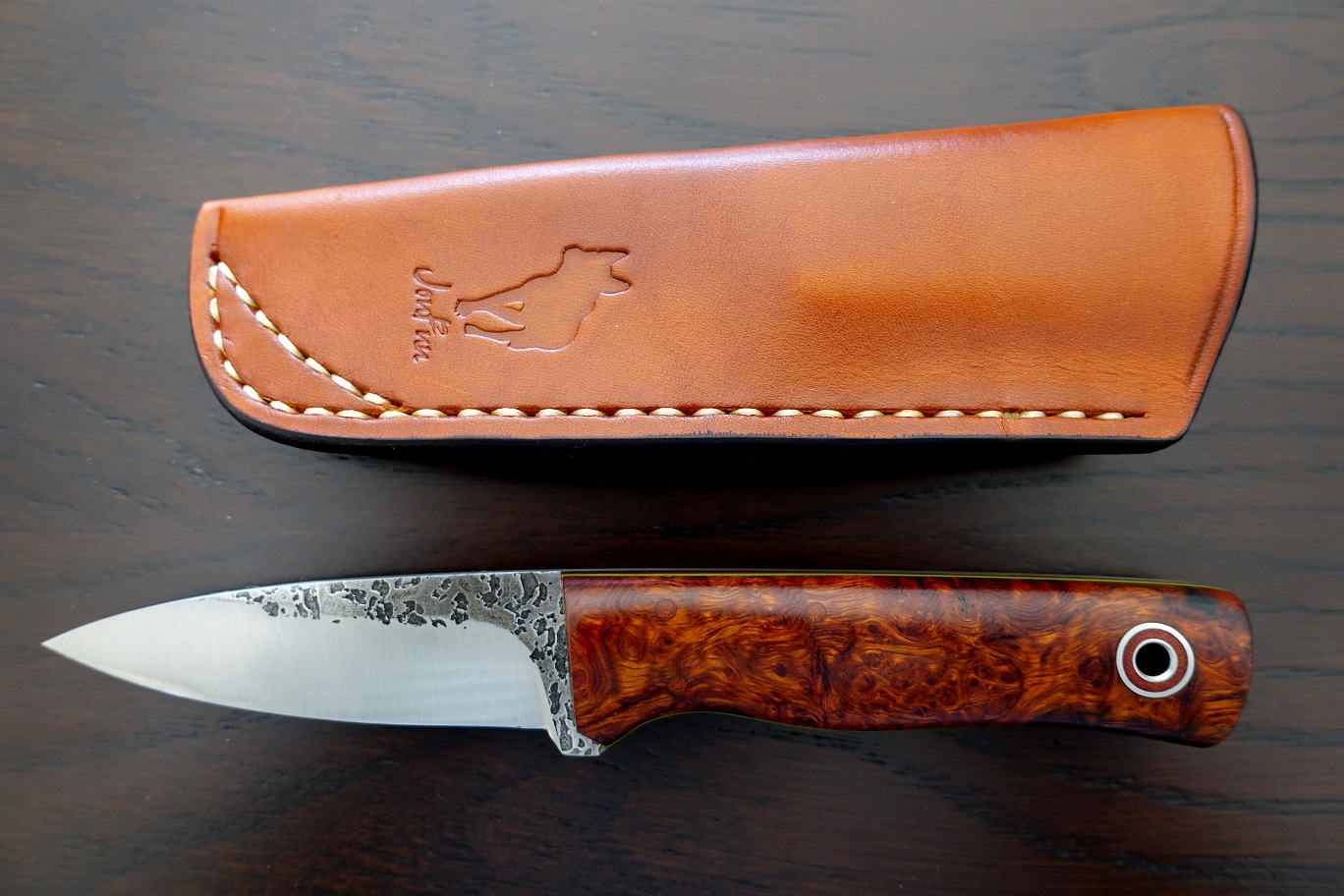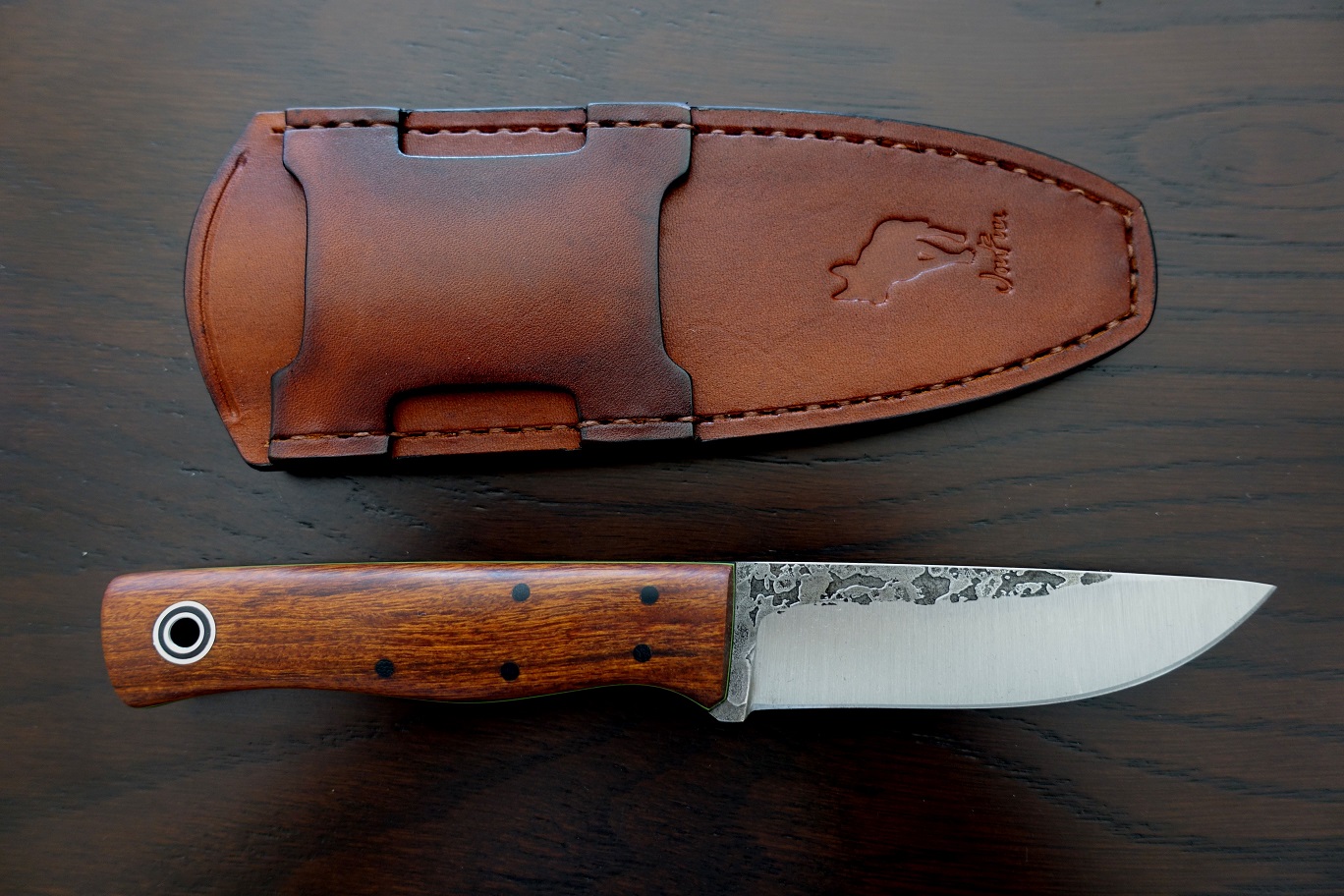 Up for sale is a Sapphire Bushnub over black with white pin stripes. Tapered tang, 5/32 thick. I am the second owner, this knife has been used, but well taken care of. I have cleaned it up and oiled it, but it still shows some user/sheath wear. It will include a JouFuu ISP sheath, and a KSF belt sheath. I am asking $235 net Paypal'd includes shipping and insurance.