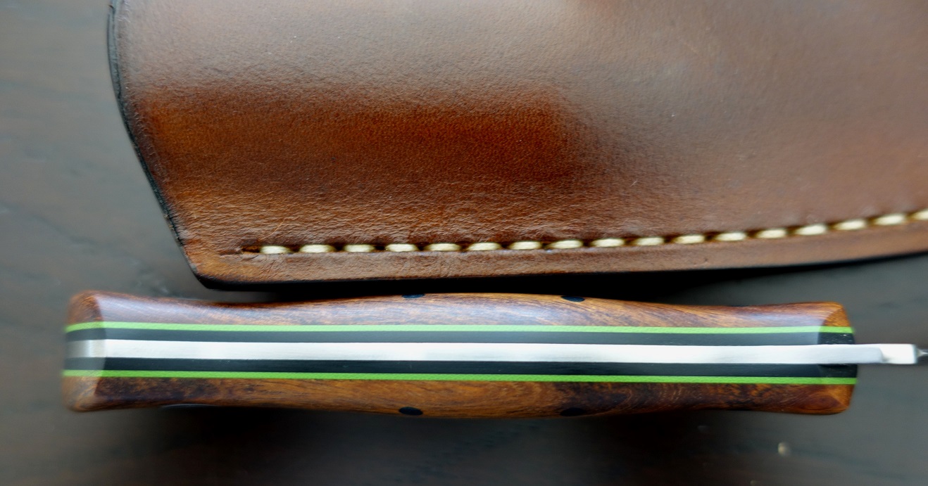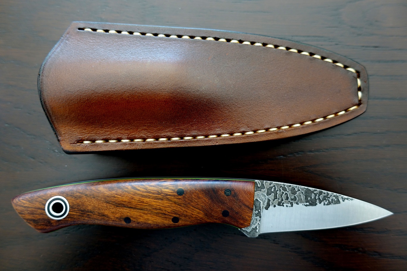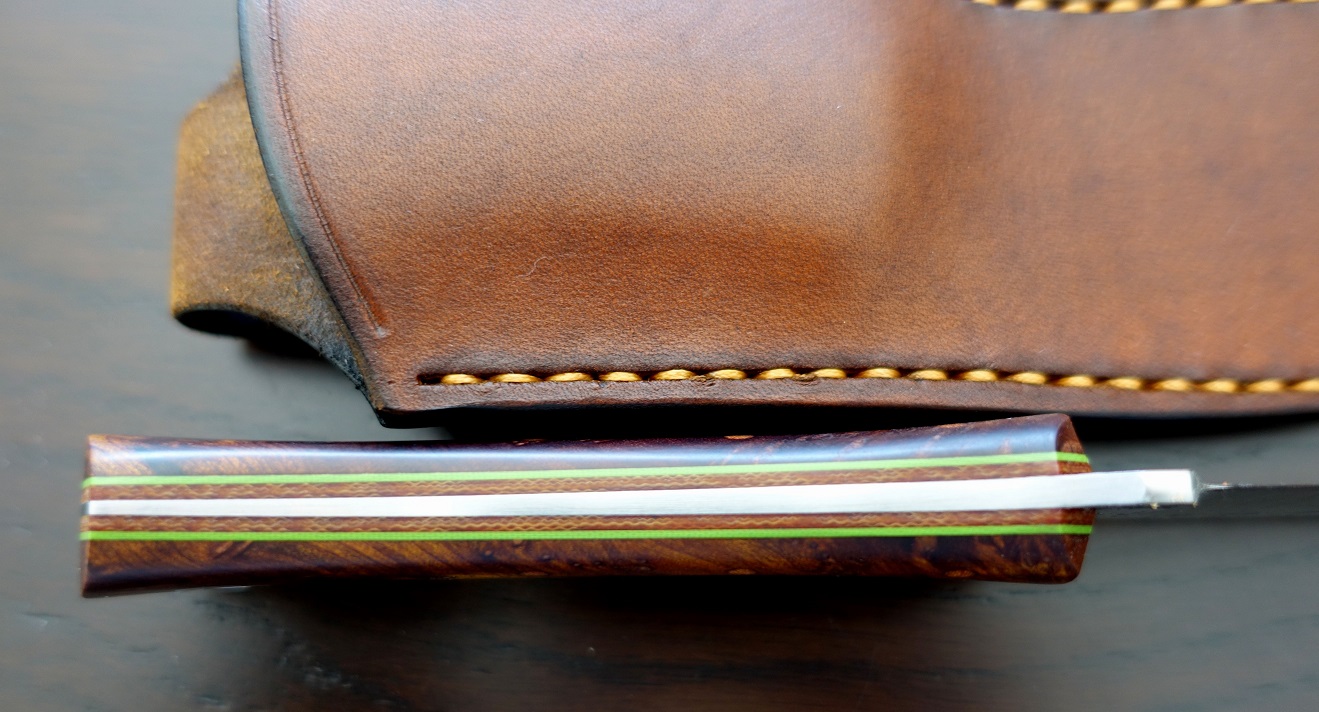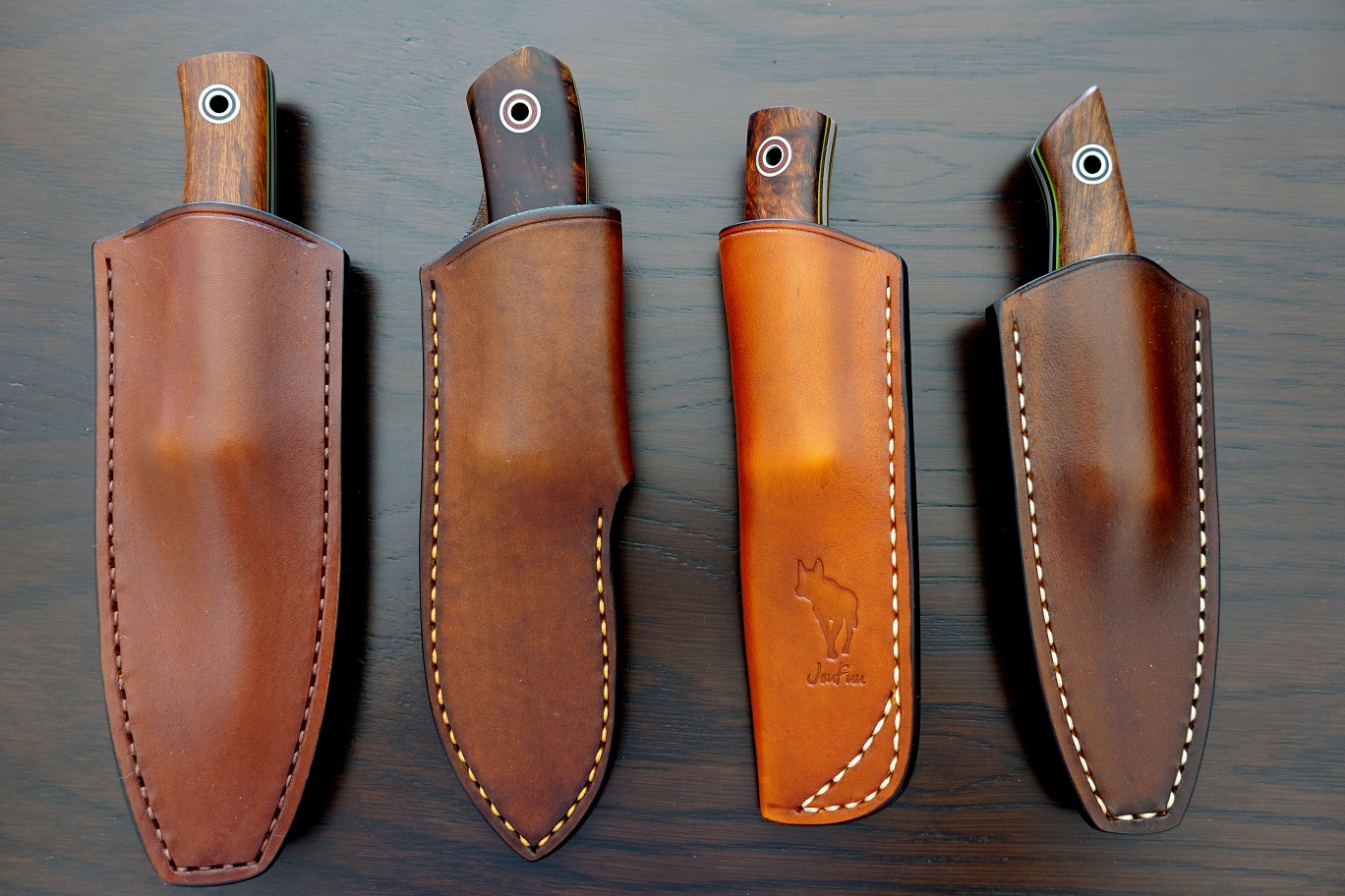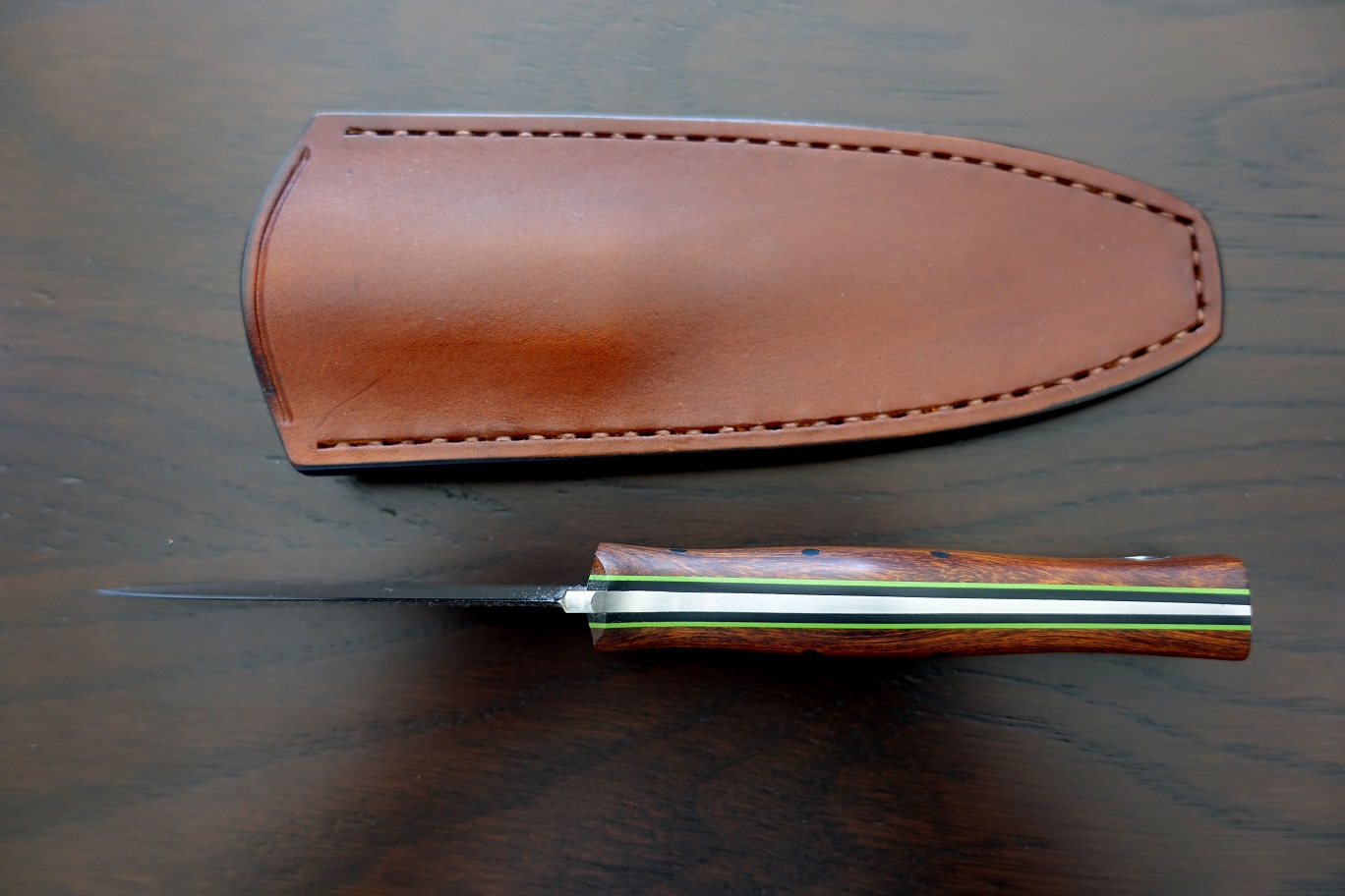 Up for sale is a Sapphire Bushnub over black with white pin stripes. Tapered tang, 5/32 thick. I am the second owner, this knife has been used, but well taken care of. I have cleaned it up and oiled it, but it still shows some user/sheath wear. It will include a JouFuu ISP sheath, and a KSF belt sheath. I am asking $235 net Paypal'd includes shipping and insurance.