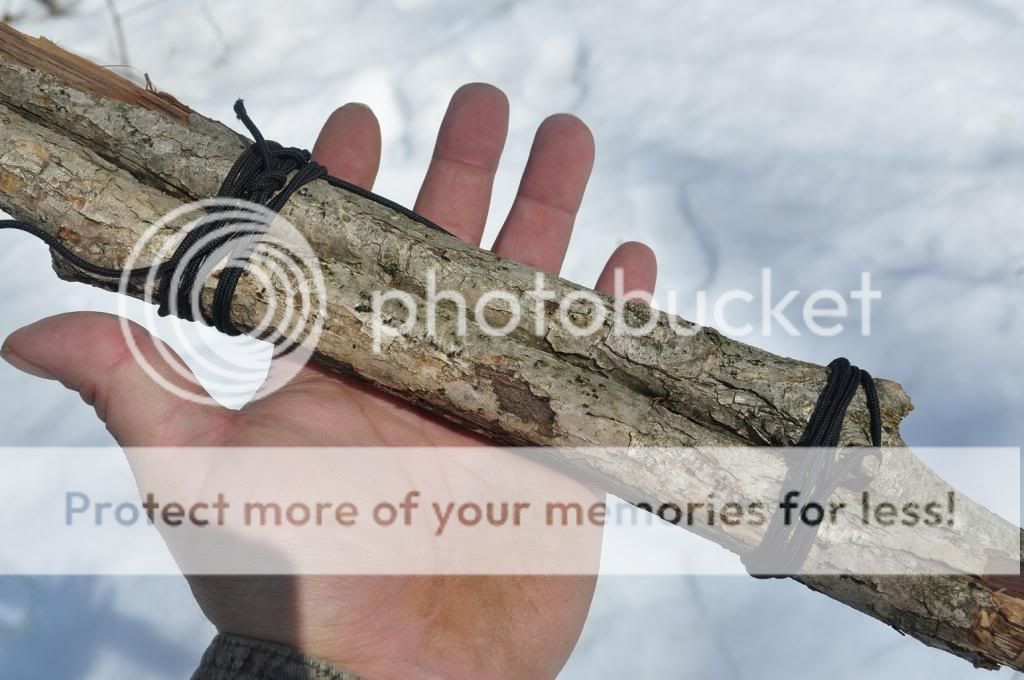 Small knives aren't much for chopping, but in smaller projects like this a good sharp knife will do fine. When I am needing or wanting a clean break in branch say maybe the size of my thumb and even larger, I use a method I call ring-and-break. I whittle a ring notch all the way around the branch to weaken it, then break it, sometimes using a tree to break it on.
