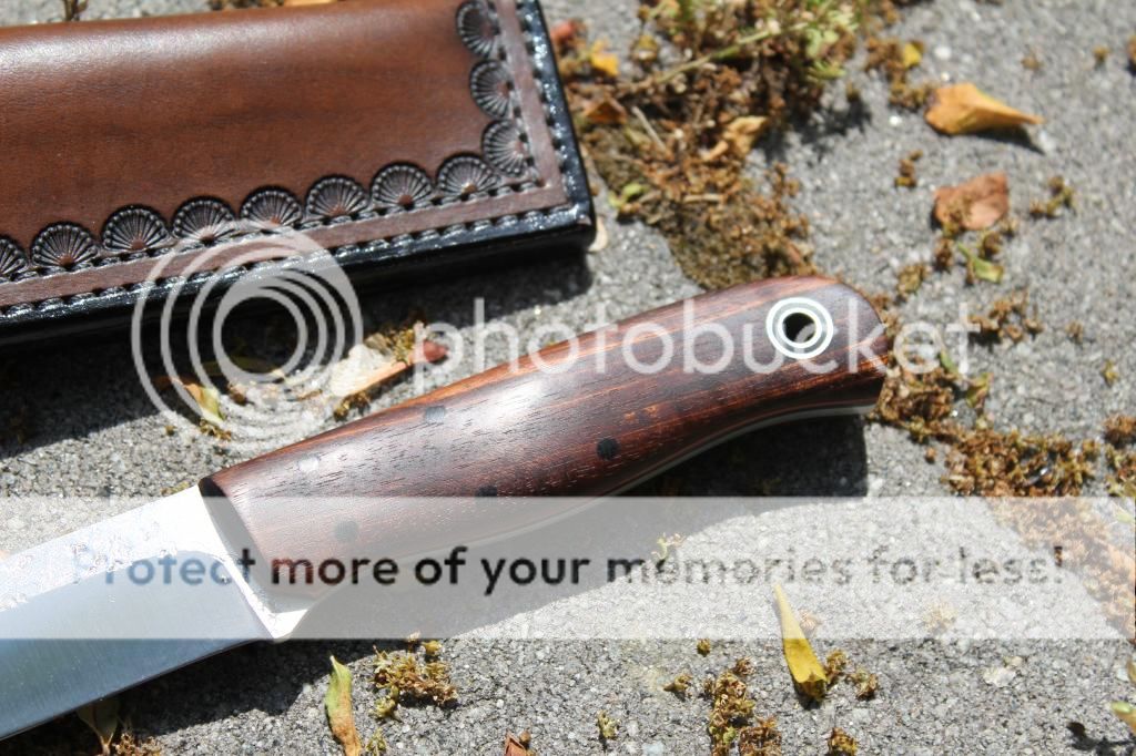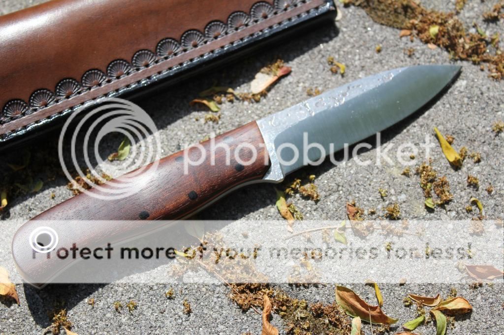 Fiddleback Forge Arete with Heber sheath -$345 $325 SOLD - 1/8" 01 with skeletonized full thickness tang, goncalo alves scales, black G10 liners and thin orange g10 pinstripe; excellent condition - lightly used a few times, polished and stropped, blade has some very faint scratches that hardly show up in the pictures, a little patina and a spot near the tip that should probably come out with another polishing.