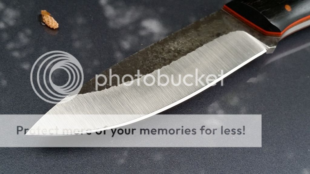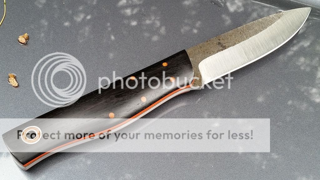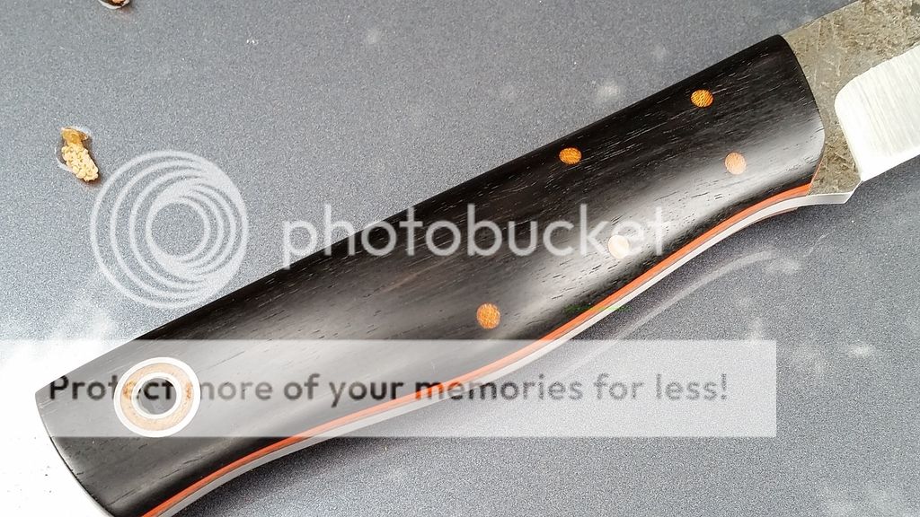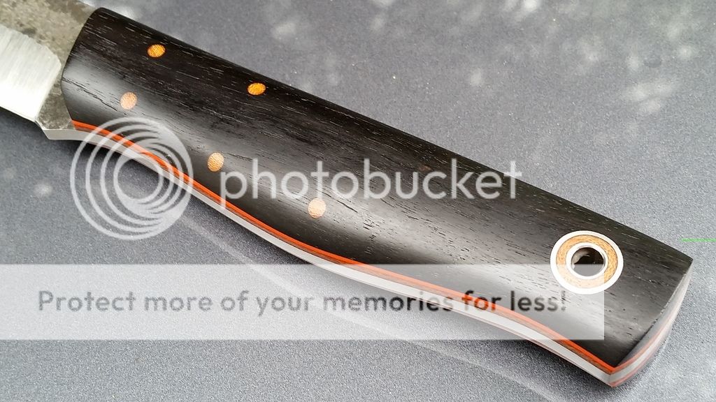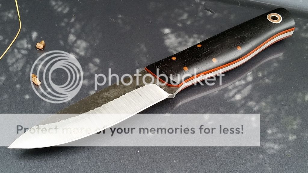 Fiddleback Forge Asp $275 - 1/8 A2 steel, skeletonized full thickness tang, tuxedo with a twist configuration - black canvas micarta, natural canvas micarta pins and liners, orange G10 pinstripes. Blade length is approximately 3.75", overall length is approximately 8.25", weight is 4.9 ounces.