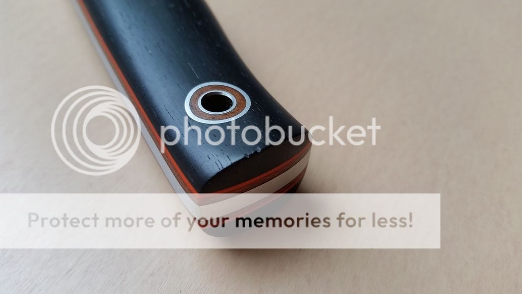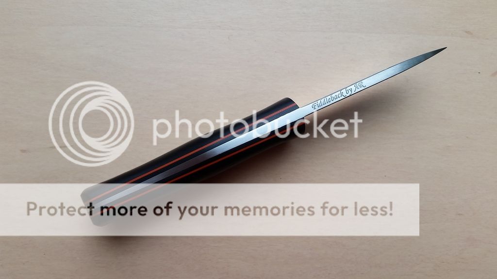 Fiddleback Forge Esquire - $270 - 5/32" A2, tapered tang, blackwood scales with black G10 liners and orange G10 pinstripes, 3.1 ounces.