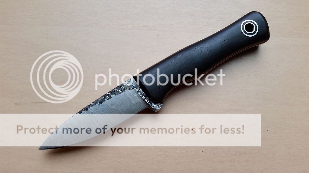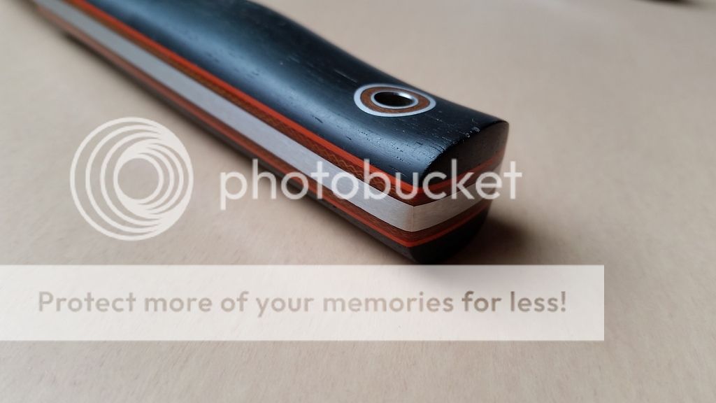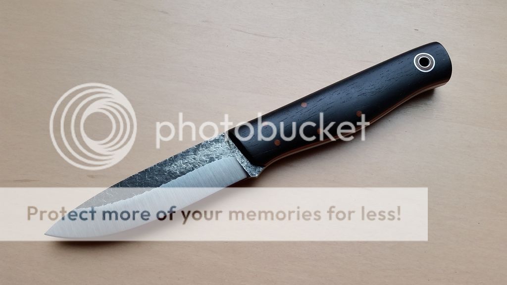 Fiddleback Forge Terrasaur - $350 - 5/32" CPM 154, skeletonized full thickness tang, blackwood scales with with natural canvas micarta liners and orange G10 pinstripes. Blade length is approximately 4 1/8", overall length is approximately 9 1/8", weight is 6.3 ounces