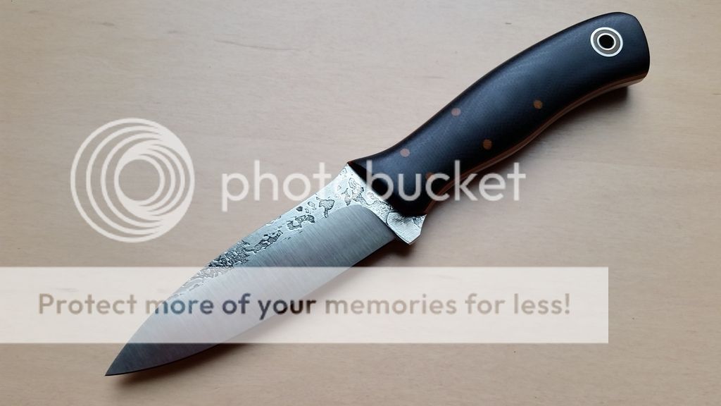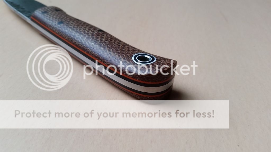 1/8 A2 steel, skeletonized full thickness tang, tuxedo with a twist configuration - black canvas micarta, natural canvas micarta pins and liners, orange G10 pinstripes. Blade length is approximately 3.75", overall length is approximately 8.25", weight is 4.9 ounces.