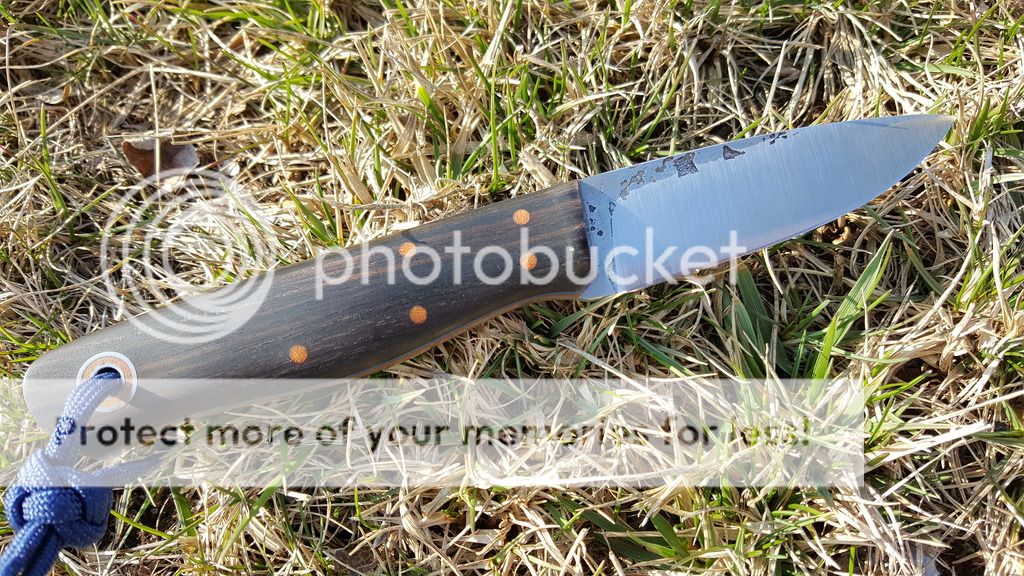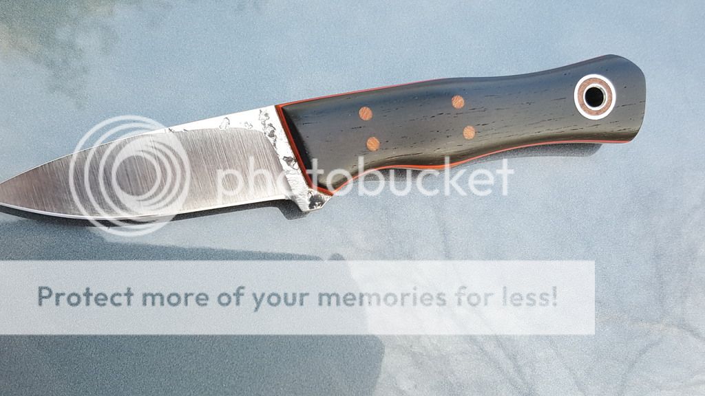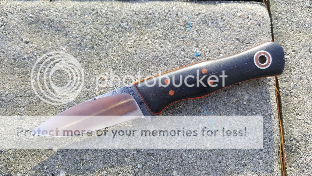 Withdrawn///Fiddleback Forge Esquire - Withdrawn///$275 - 5/32" 01, tapered tang with blackwood scales, natural micarta liners, and orange g10 pinstripes. Blade length is approximately 2.75 inches, overall length is approximately 6.38 inches, weight is approximately 2.8 ounces. The knife is in great condition - lightly used and carefully stropped and polished. Some minor signs of use. Some faint patina and spots remain that show up in some of the pictures below. It is the smaller knife on the bottom in the pictures with two knives. No sheath.