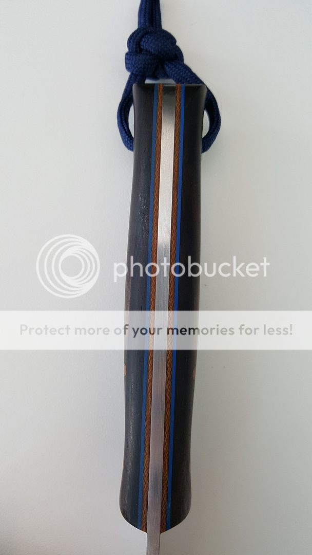 SOLD///Fiddleback Forge Handyman with JouFuu ISP sheath- SOLD///$375 - 1/8" 01, skeletonized full thickness tang with blackwood scales, natural micarta liners, and blue g10 pinstripes. Blade length is approximately 3.3 inches, overall length is approximately 7.6 inches, weight is approximately 4.6 ounces. The knife is in great condition - lightly used and carefully stropped and polished. Some very minor signs of use. Some very faint patina remains. Comes with JouFuu ISP sheath that has been carried a few times and has a some faint scuffs and scratches.