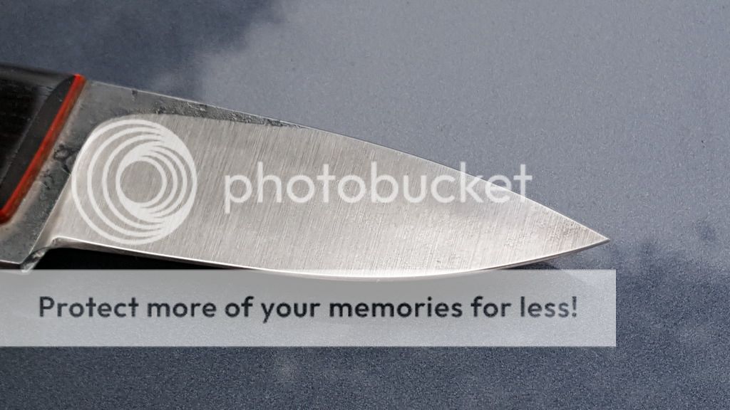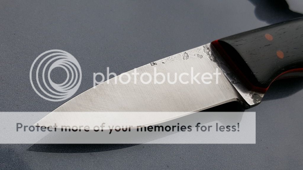 Fiddleback Forge Esquire -$260 $240 USPS Money Order or Paypal gift/ $250 Paypal goods - 5/32" 01, tapered tang with blackwood scales, natural micarta liners, and orange g10 pinstripes. Blade length is approximately 2.75 inches, overall length is approximately 6.38 inches, weight is approximately 2.8 ounces. The knife is in great condition - lightly used and carefully stropped and polished. Some minor signs of use including some faint patina and spots remain that show up in some of the pictures below. It is the smaller knife on the bottom in the pictures with two knives. No sheath.