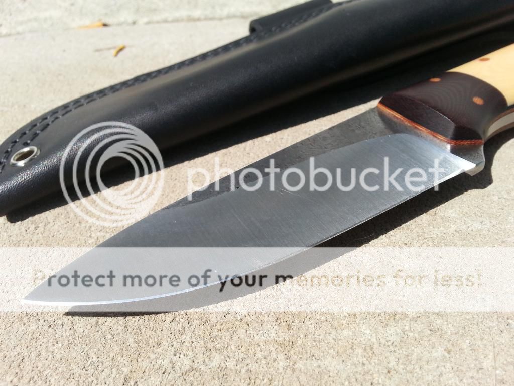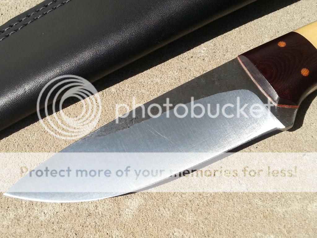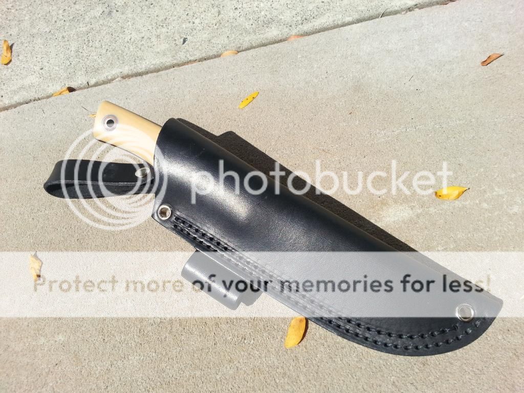 The knife is in great/excellent condition - lightly used a few times, stropped once or twice, polished once. Comes with a Blind Horse #9 dangler black leather sheath. The knife and sheath have just a few minor scuffs and scratches that are shown in the pictures below.