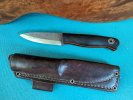 Up for sale is my daily user for the last 7 years. Old school KEB from the earlier days of Fiddleback Forge. FAT handle. Black/natural/orange liners. O1 steel. Lightly convexed scandi.