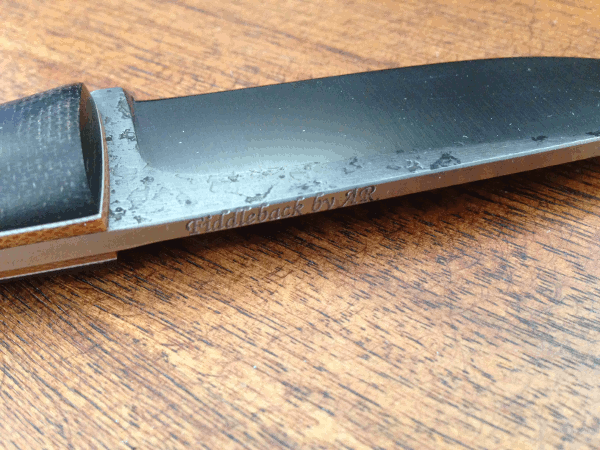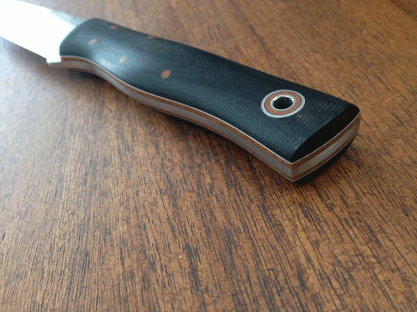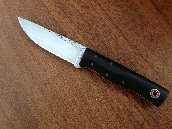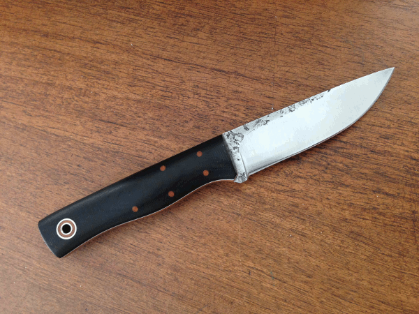 Fiddleback Forge Recluse in O-1 and "Tuxedo" (Black micarta over white pin-stripe G10 over natural canvas micarta with ncm pins). 1/8" skeletonized full tang. I am not the first owner. I have never used it, and it doesn't appear to have been sharpened or used by the previous owner. Nice spalting on this one. $249 shipped via USPS Priority Mail, payment by PayPal.