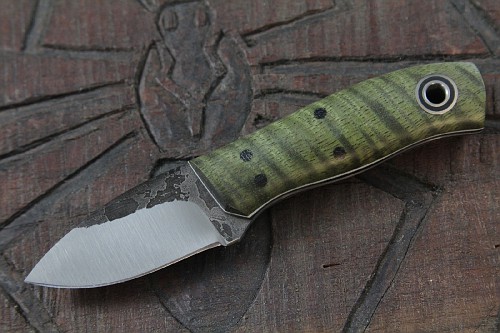 2015 0505 19 Tumble finished Kephart w/ green herringbone burlap over natural w/ white pinstripes, SFT Tang, convex on 1/8 spalted 01 steel - $290