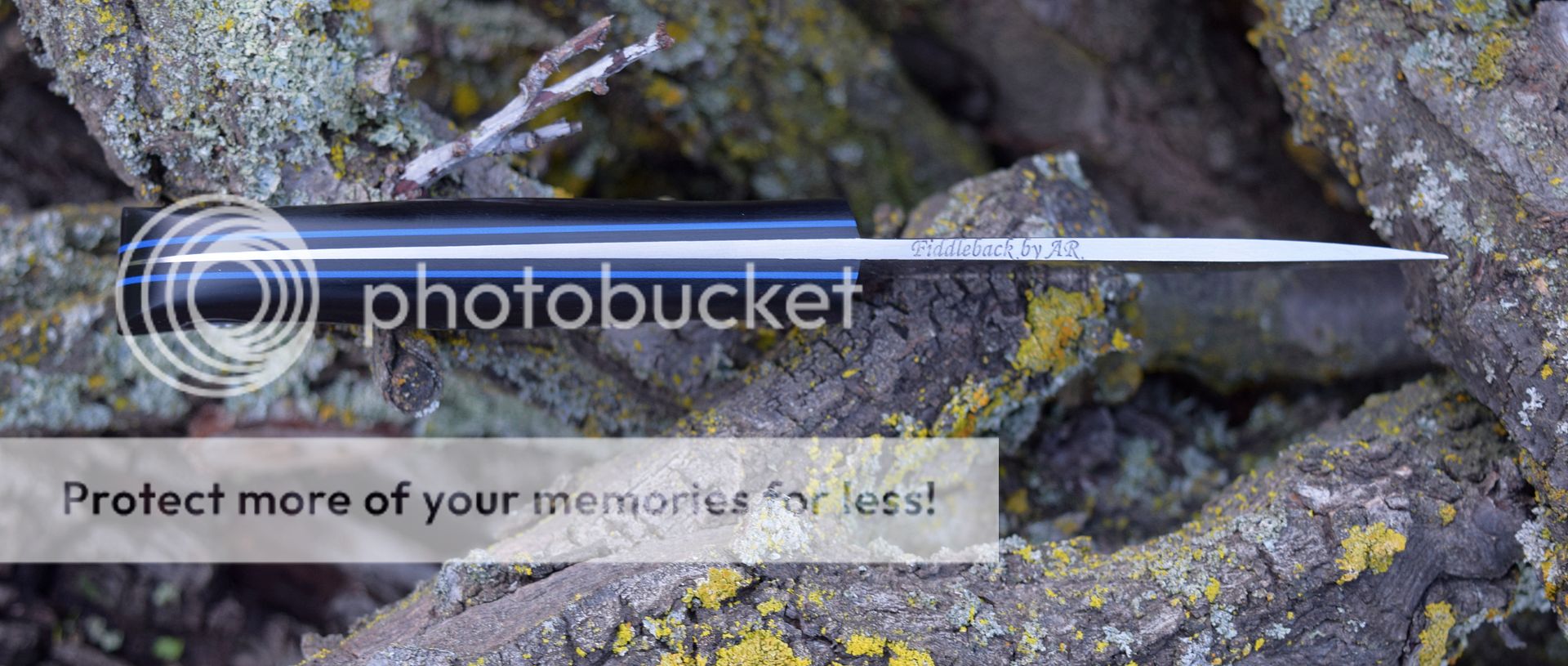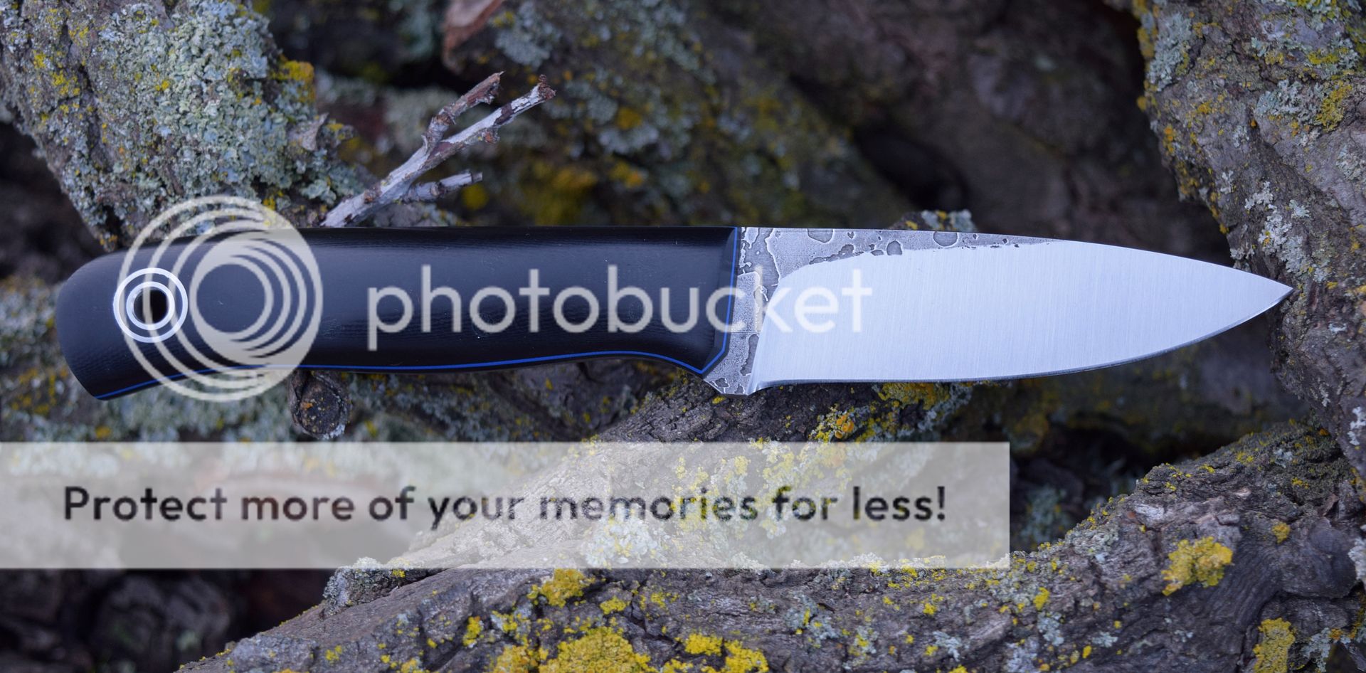2016 0617 10 Hiking Buddy w/ black G10 over black liners & blue pinstripes, TT (i.e. tapered tang), Convex on spalted ⅛ A2