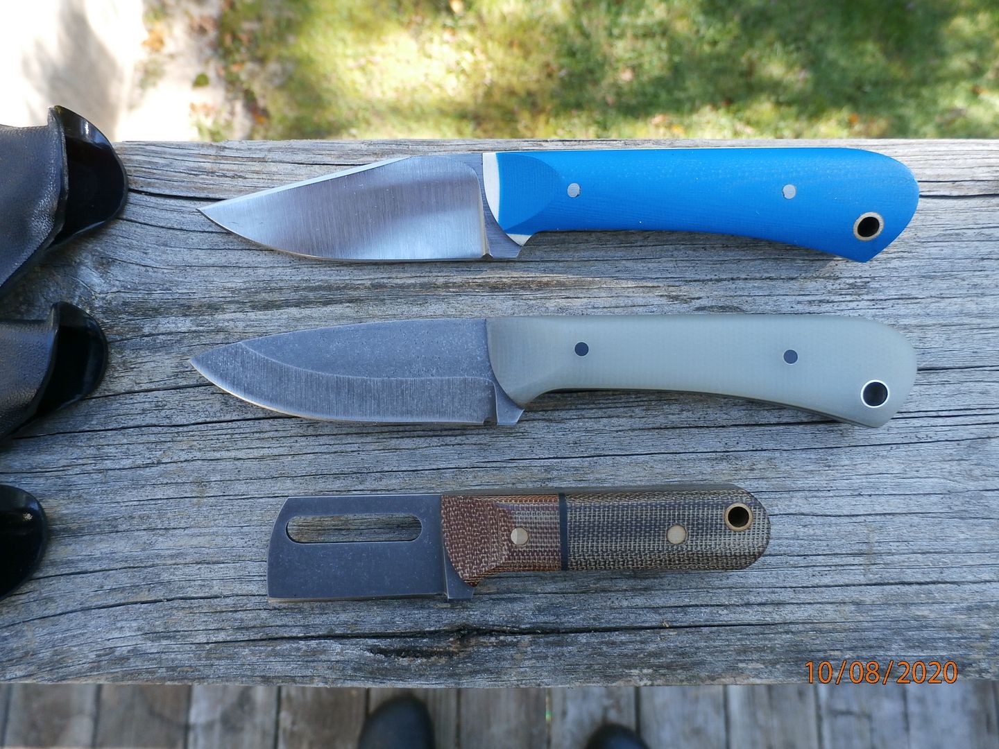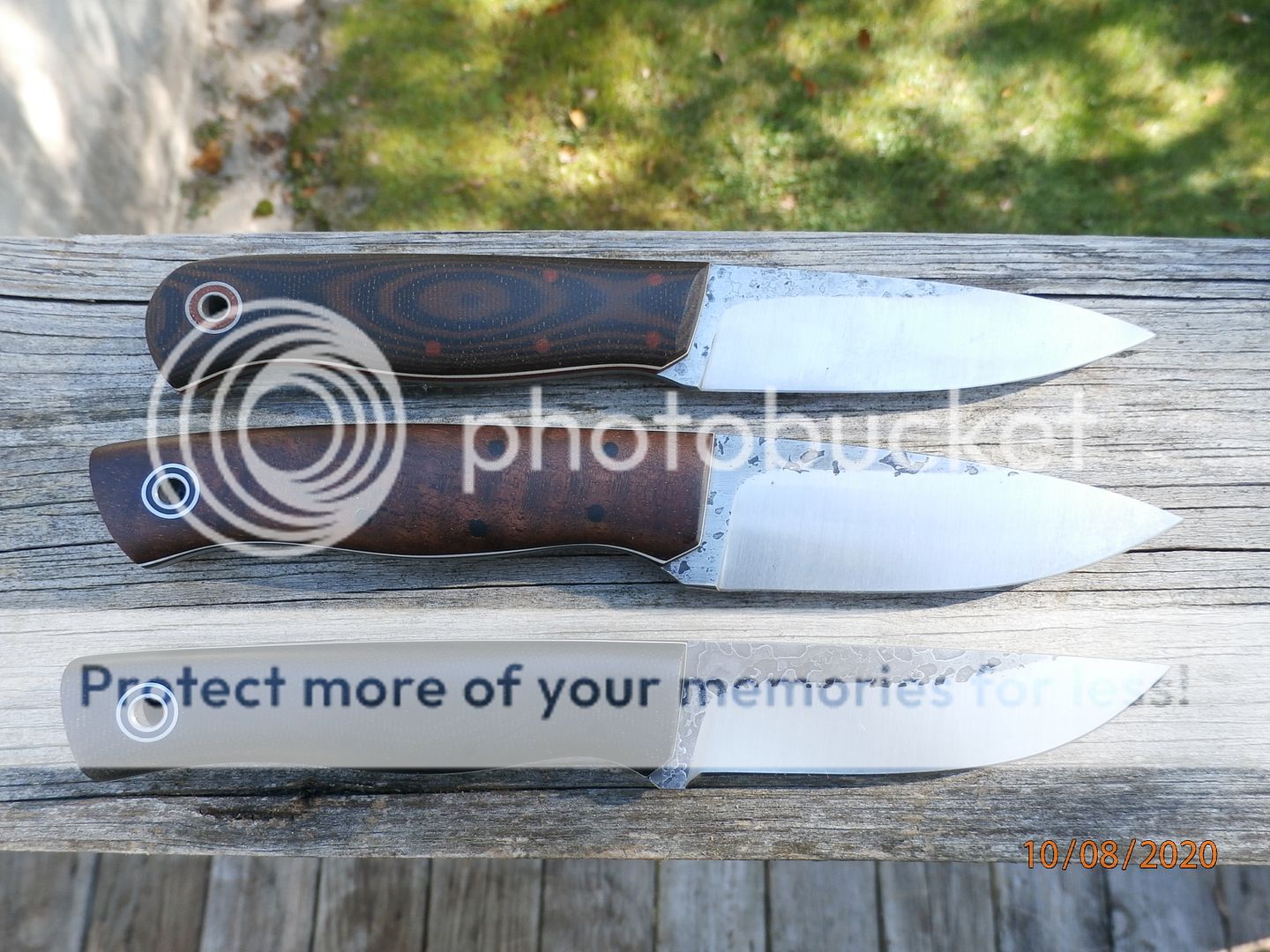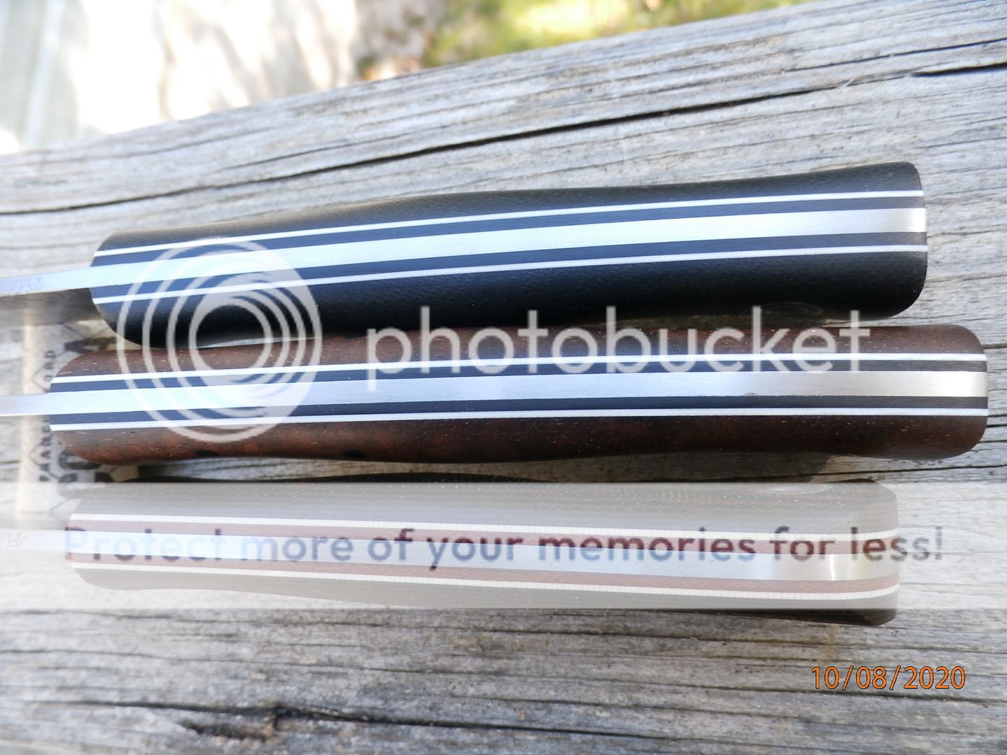 For sale. KEBushie used once to make feather sticks. 1/8" 01 with black and brown micarta over natural liners and white pinstripes. $200.00 PP F&F. New/unused Bushfinger, 1/8" 01 with Walnut over black liners and white pinstripes $250.00 PP F&F. New/unused Recluse, 1/8" A2 with black micarta over black liners and white pinstripes. $250.00 PP F&F. All ship USPS Priority.