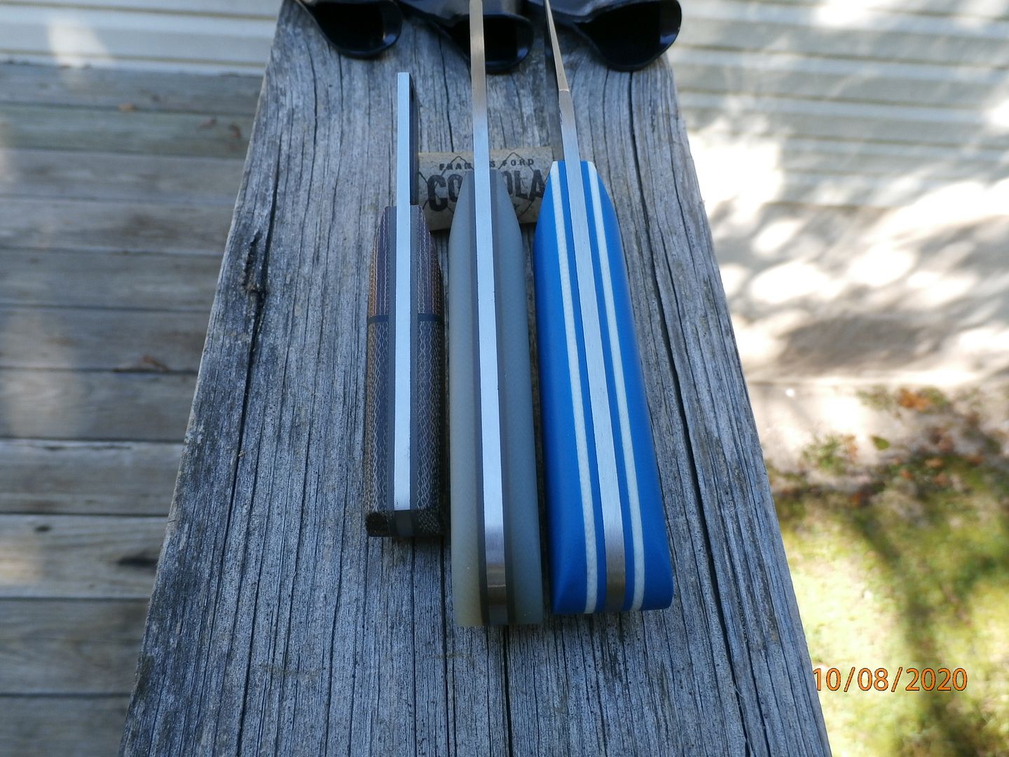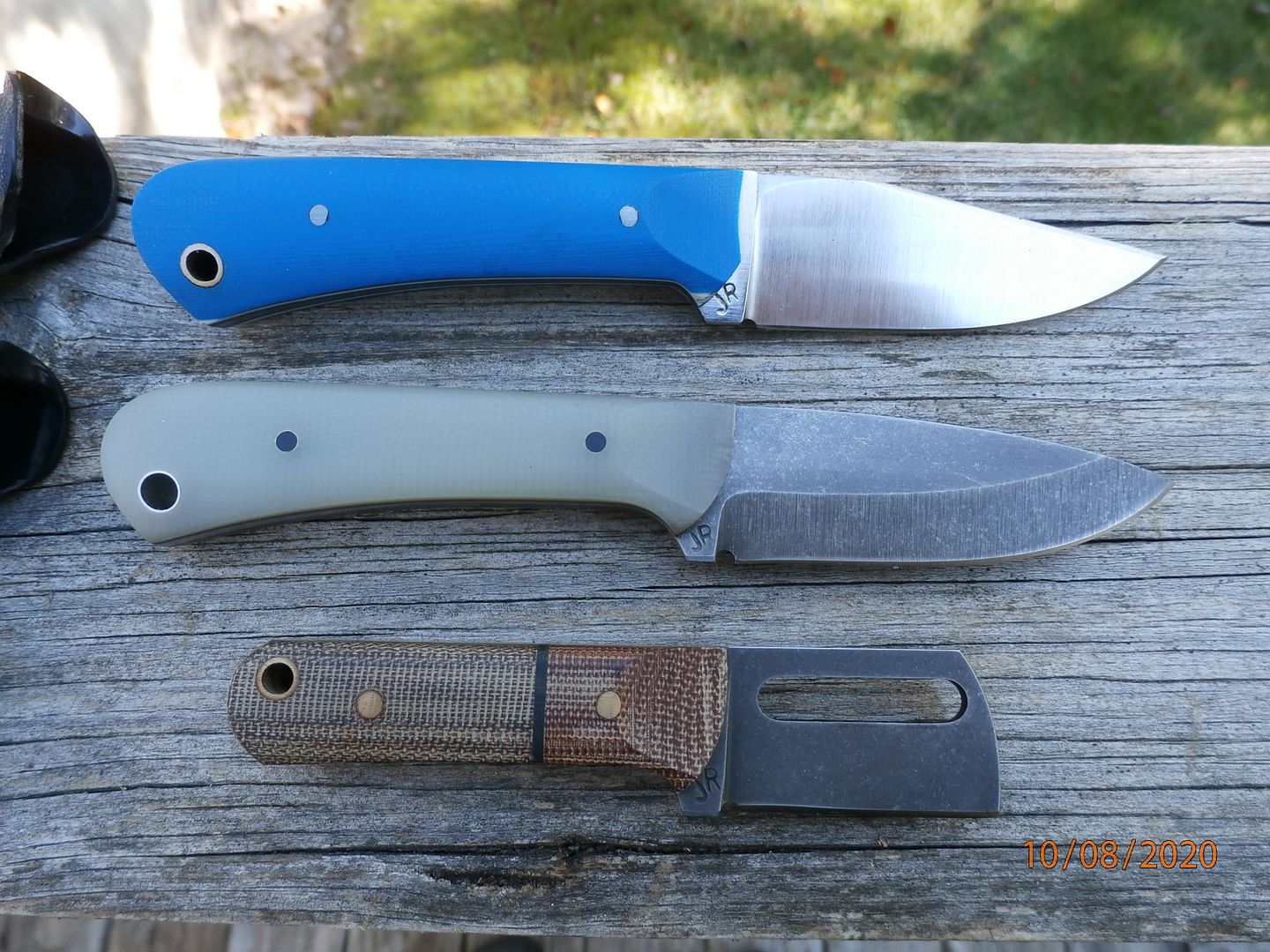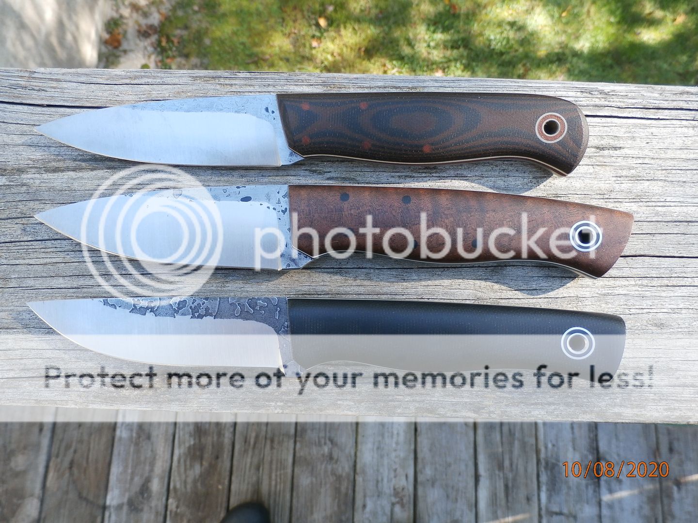 For sale. KEBushie used once to make feather sticks. 1/8" 01 with black and brown micarta over natural liners and white pinstripes. $200.00 PP F&F. New/unused Bushfinger, 1/8" 01 with Walnut over black liners and white pinstripes $250.00 PP F&F. New/unused Recluse, 1/8" A2 with black micarta over black liners and white pinstripes. $250.00 PP F&F. All ship USPS Priority.