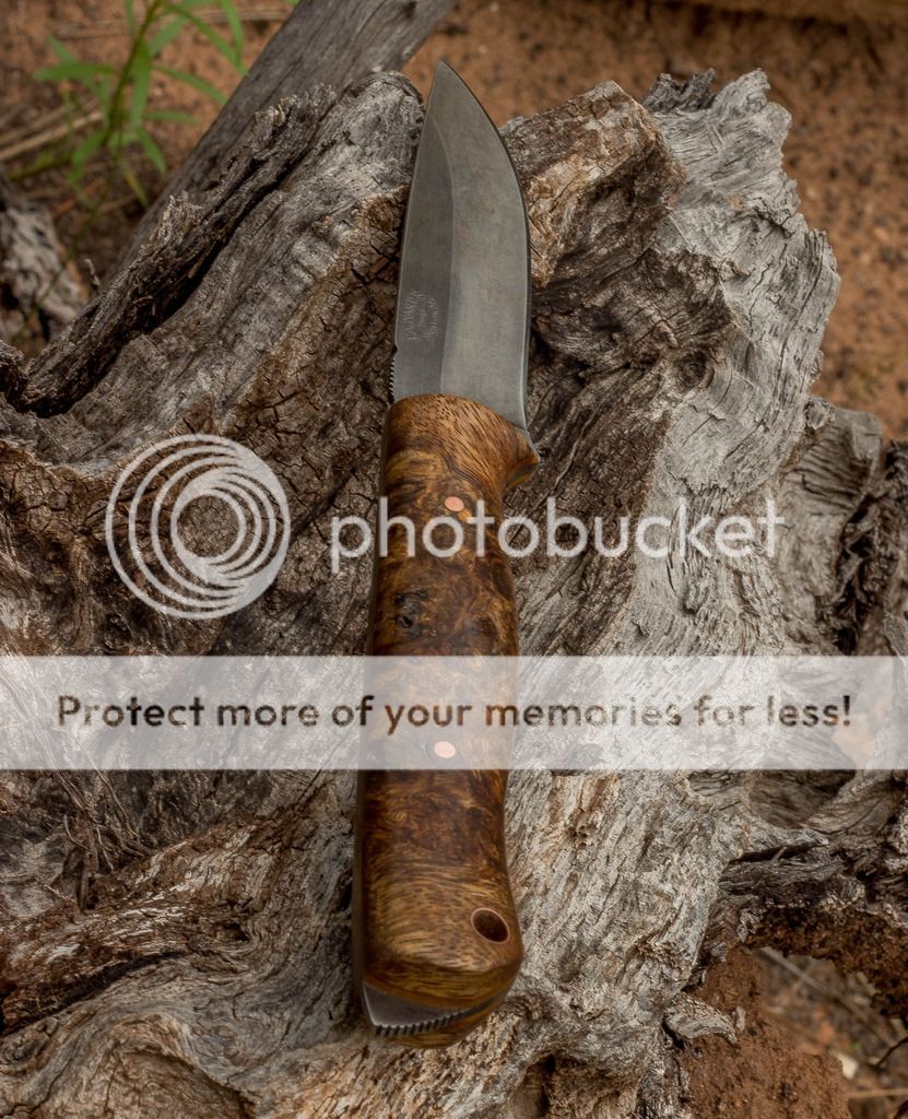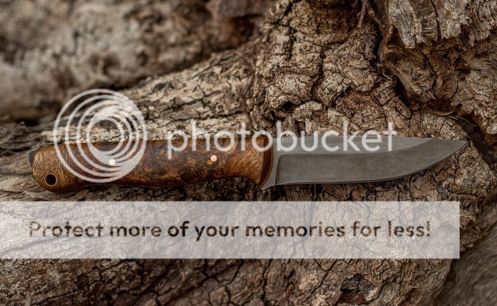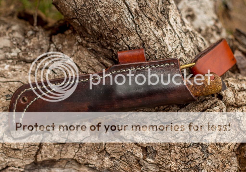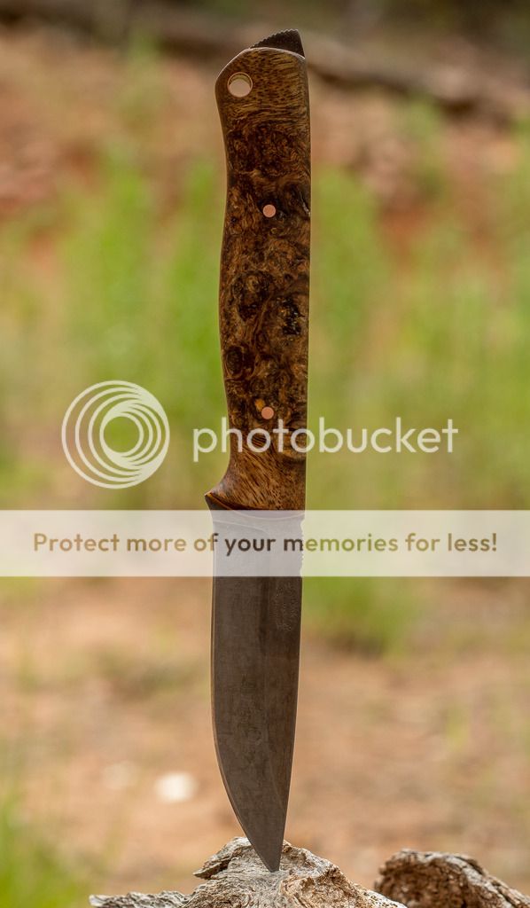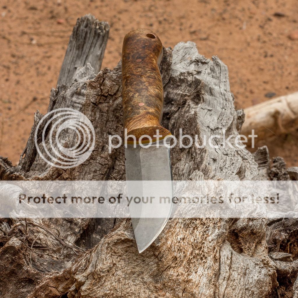 I have for sale today my Field Knife model. This one has a 1095 blade with an antiqued finish. The scales are a stabilized mystery burl the name of which escapes me. Copper pins/tube with natural Micarta and cinnamon spacers round out the handle. I left a jimped exposed butt on the knife that is useful when needed. I use mine to knock the ice of my gear when winter camping. This one also come with my new bushcraft sheath. The sheath has a conventional belt loop and dangler loop, 10oz weight and is hand stitched. Thank you for looking, Jeff