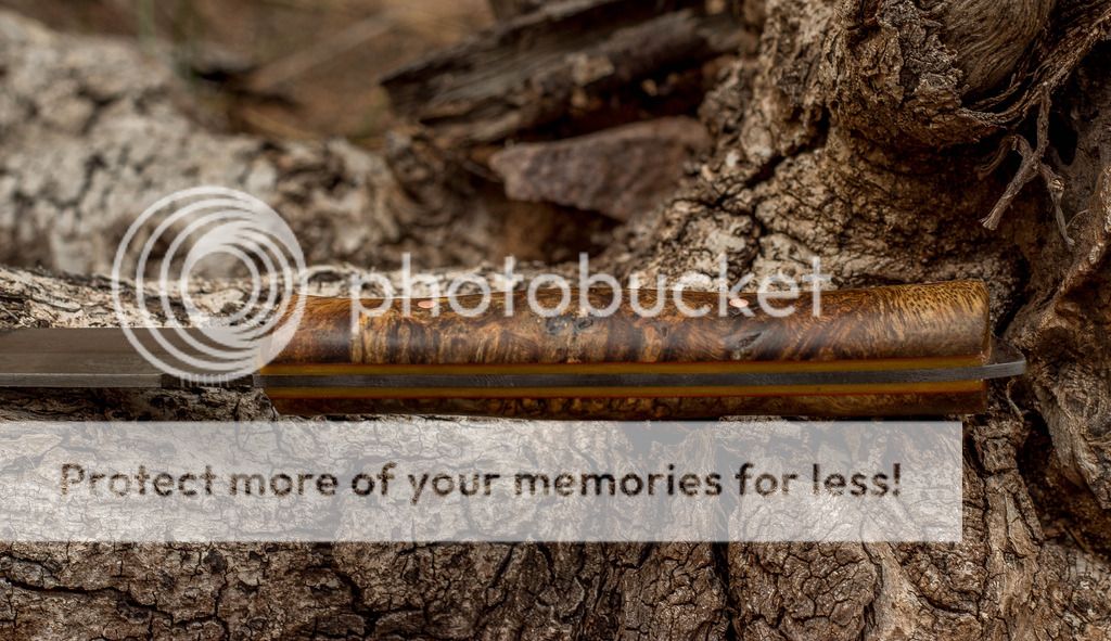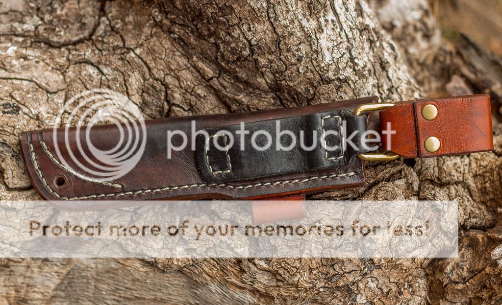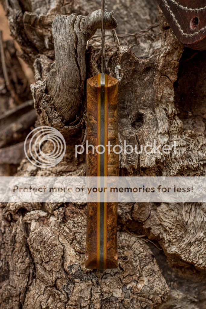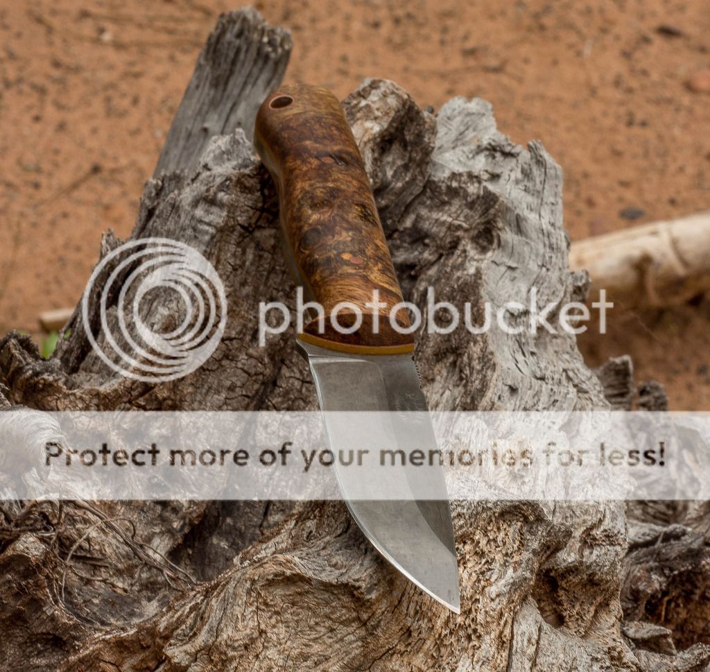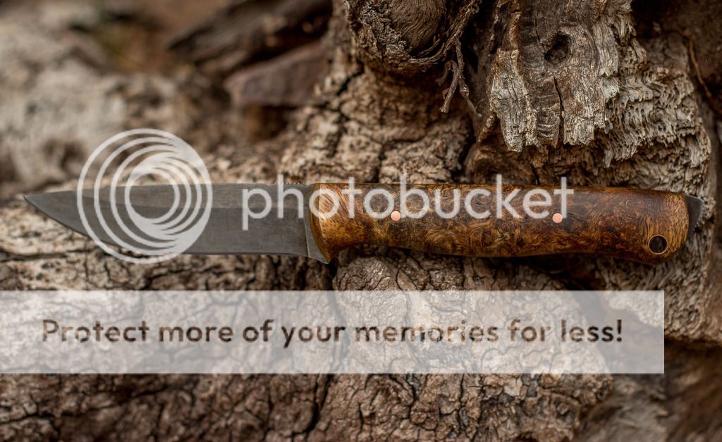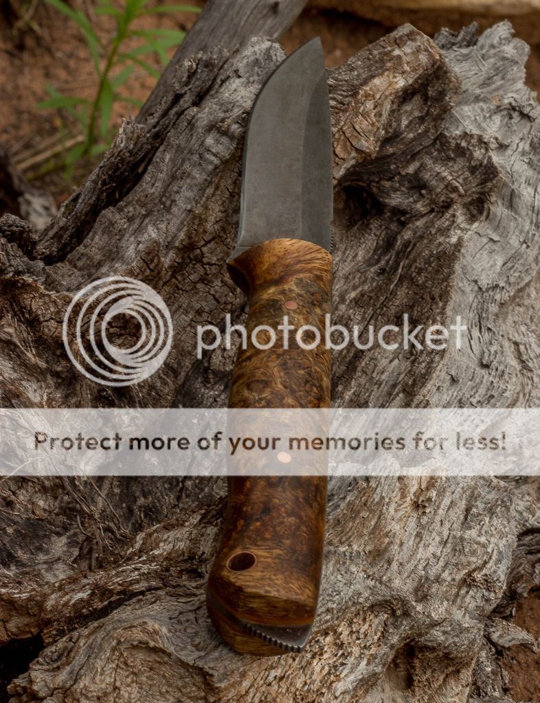 I have for sale today my Field Knife model. This one has a 1095 blade with an antiqued finish. The scales are a stabilized mystery burl the name of which escapes me. Copper pins/tube with natural Micarta and cinnamon spacers round out the handle. I left a jimped exposed butt on the knife that is useful when needed. I use mine to knock the ice of my gear when winter camping. This one also come with my new bushcraft sheath. The sheath has a conventional belt loop and dangler loop, 10oz weight and is hand stitched. Thank you for looking, Jeff