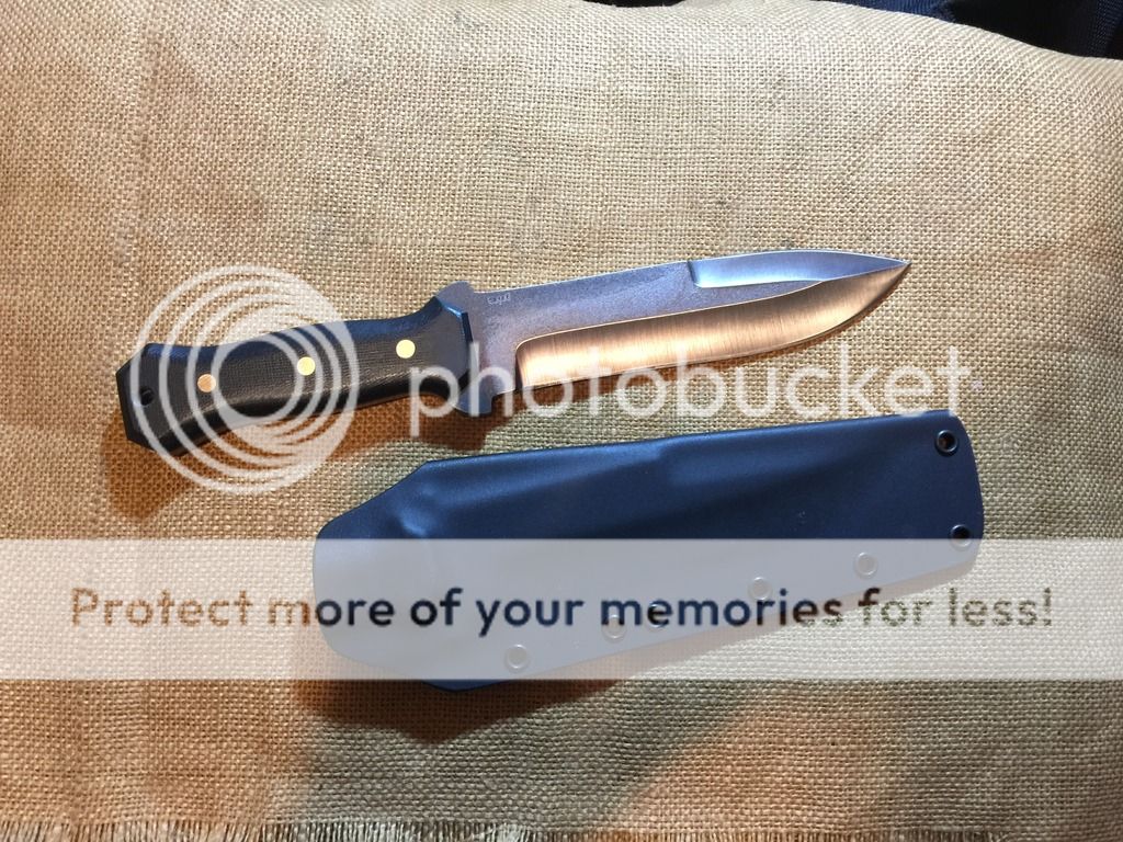 Got another in a similar rough styled finish of some recent design ideas. This is a neat, tough knife fit for a combat zone! Black G10 scales over 1/4in thick 5160. Sheath is black Kydex that can fit a large size Tek Lok(not included). Overall it is 12 1/4in with a 7 1/8in blade tip to handle. This is based on an old Martin Kruse style combat knife that caught my imagination so long ago