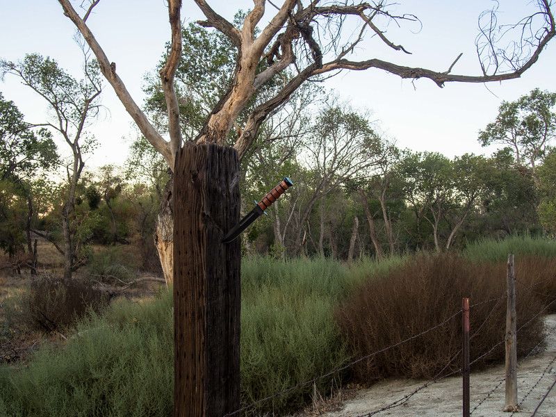 I stopped to marvel at how sharp the blade was and look at my finger -- not too bad, a little Merthiolate and a band-aid would take care of it. Then into my mind popped the words from some old Samurai movie: "A warrior mustn't draw his blade without the shedding of blood," and I wondered about the wording in the original. Did it mean that the warrior ought not to draw his sword if he didn't intend to shed someone's blood? Or did it mean that the blade was so sharp he wouldn't be able to get it out of its scabbard without cutting himself? Not only is this 1217 sharper than any knife I recall getting but the tip is pointier and needle sharp. But I managed to hike a bit this morning without shedding any more blood.