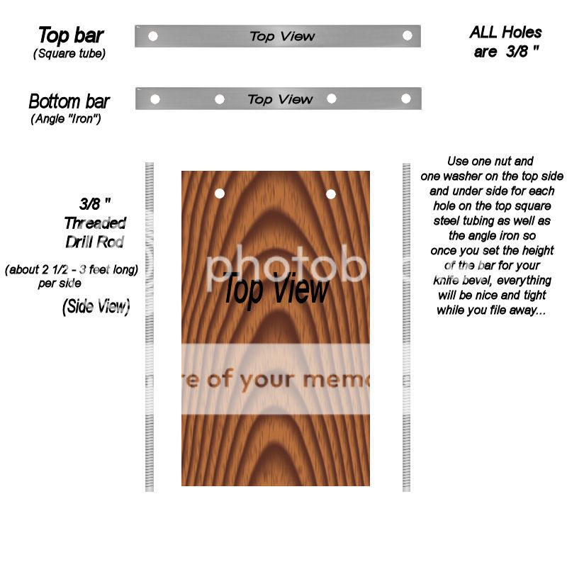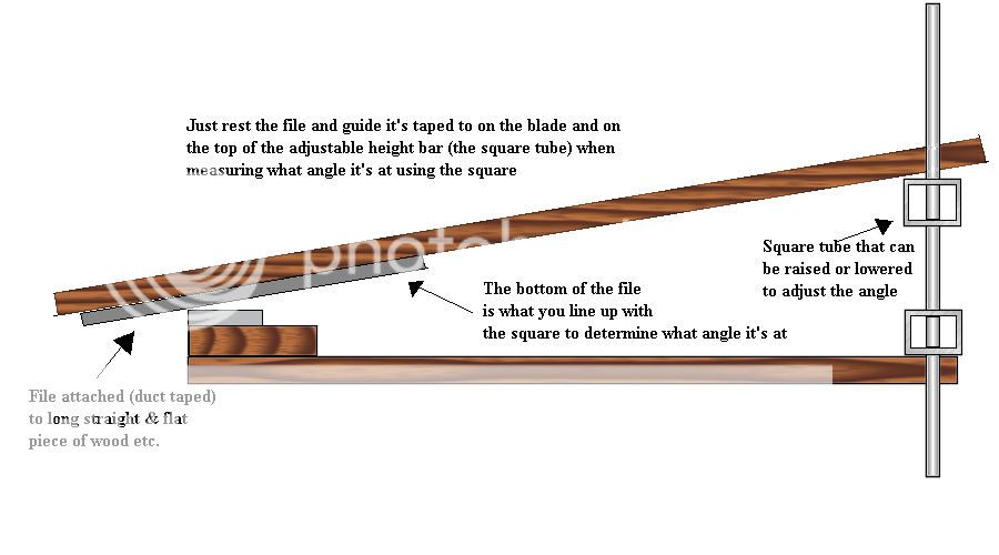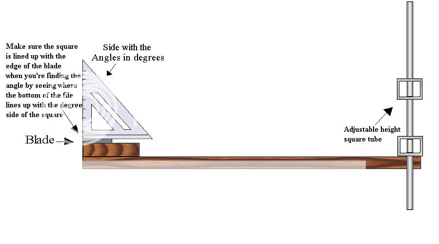 Before I started my first blade I looked into how others were filing their blades. I came across a few different jig setups. At first I wanted to make an advanced fancy jig but my wife suggested making a simple on until I made a few blades and was sure it was somthing I wanted to do. I took her advice and held off on order the parts for a fancy one as we are on a tight budget to begin with. I decided to tape my file to a lenght of 4130 cromoly tubing I had left over from a bike frame project. I clamped the blade on the edge of my bench and laid the file on top of it. I place a piece of angle iron under the tubing and moved it away from the blade until i got to the angle I wanted using my square machinist protractor to measure. It was then that I realized that the further I filed and closer I got to my edge line the steeper the angle would get. I searched google for bevel geometry equations for a full flat grind knowing it would bring me here as well as a few other places. I came across trig equations, a nifty chart, and the general answer of this is why using a jig for filing or grinding isn't the best option. None of which were the answer I was looking for. So I drew a rectangle being my blade blank and 2 angled lines being my file. One went to the center of the edge of the rectangle the other to the top corner of the edge to show my wife the angle would change as I filed and that I wasn't crazy. I then thought, why not just figure out the angle I needed to start with to give me the end angle I needed for the full flat grind. There was the math and precise drawing I didin't want to try and do. As I sat here looking for other answers on the internet I noticed the icon for my CAD program and then it clicked. So correct me if I'm wrong. This is what I came up with.