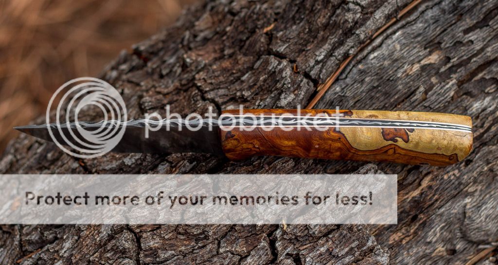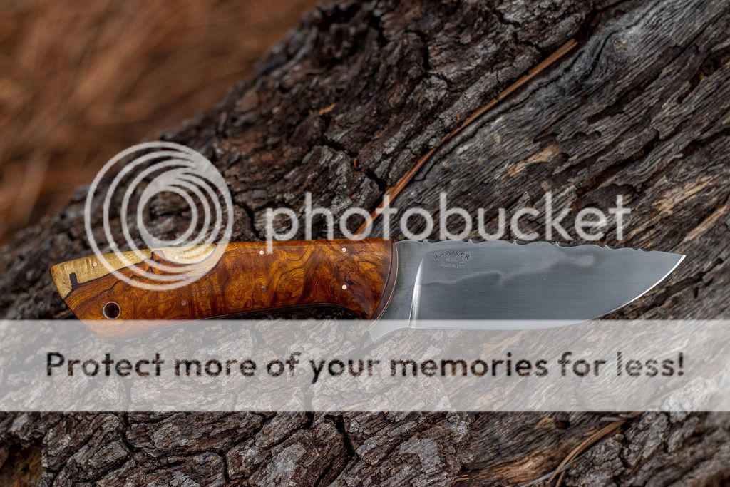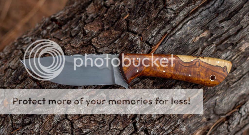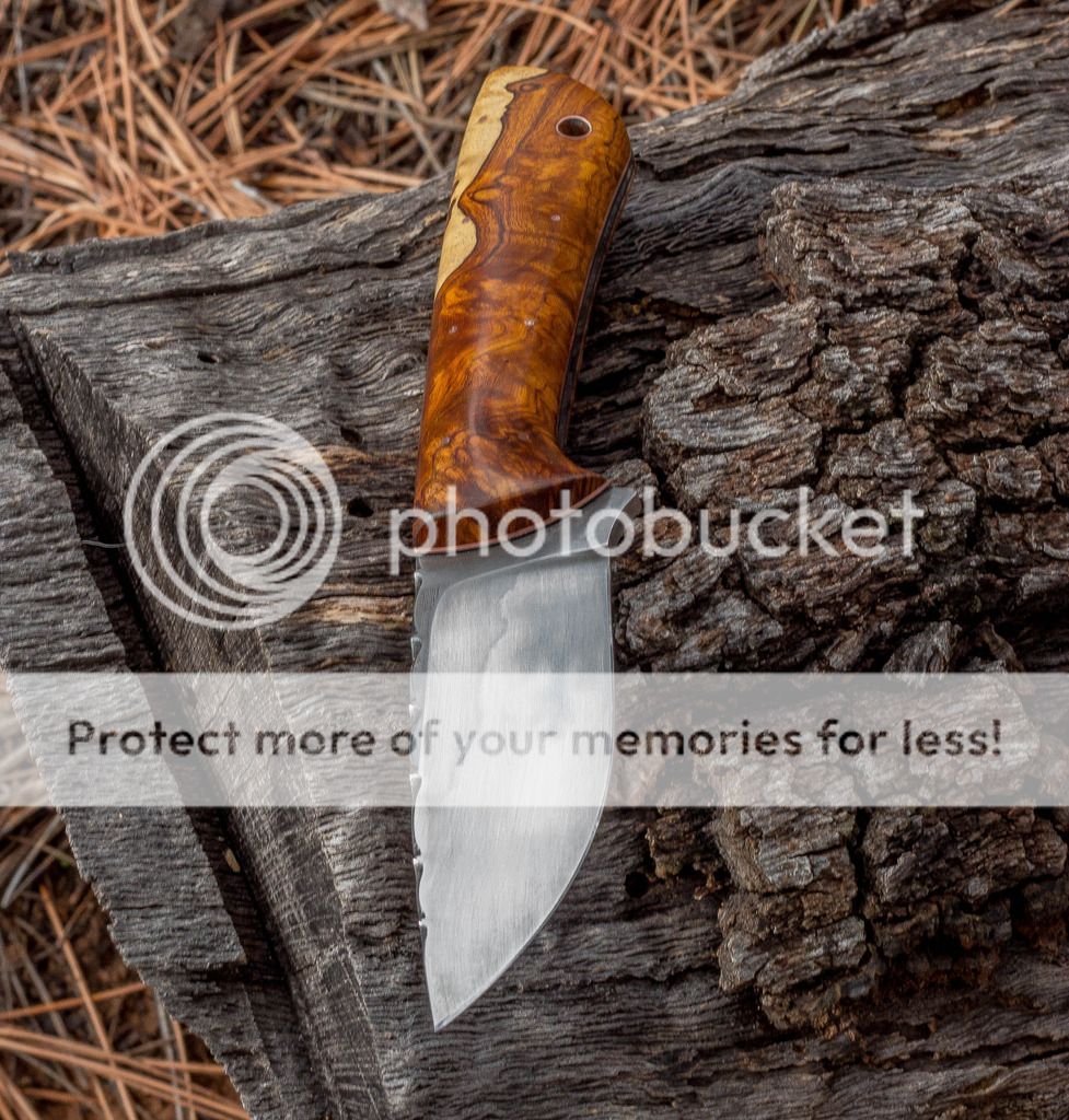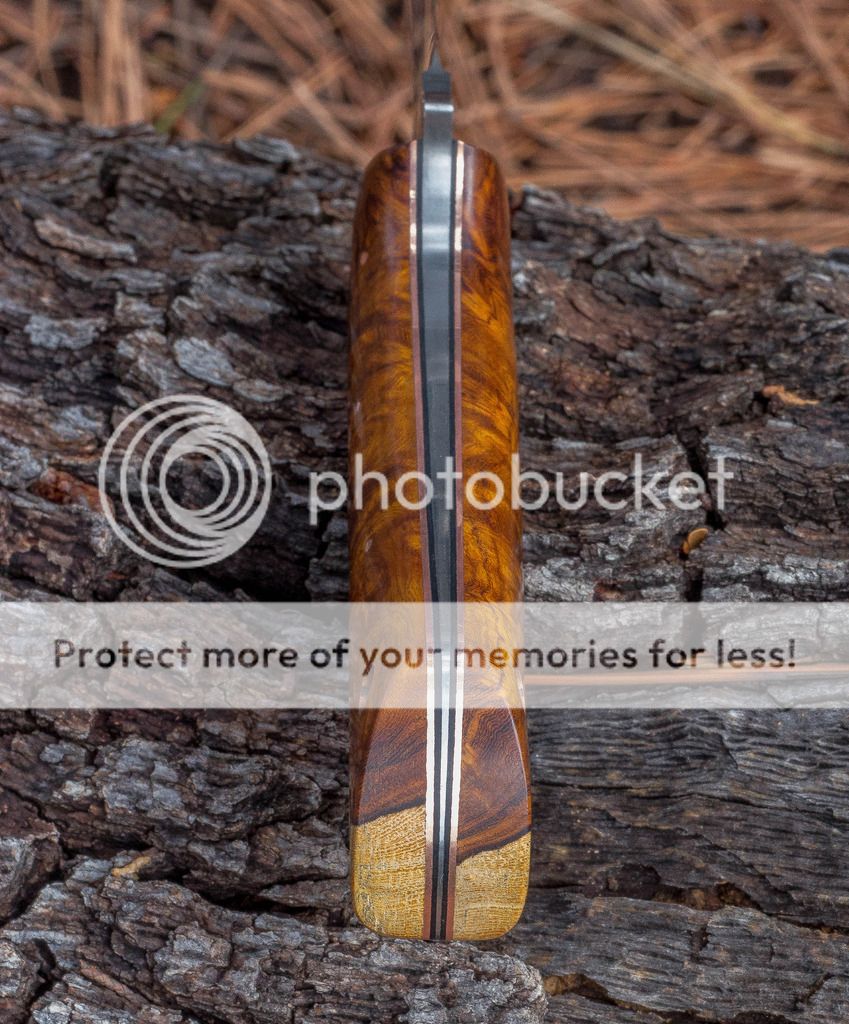 I just finished this custom order Wilderness Hunter. This one has a clay quenched 1095 blade with exposed hamon and a 2k grit hand rubbed finish. The tang has a really thin taper with vine pattern filework that gets proportionally smaller as the blade tapers in both directions. The scales are ironwood burl with sapwood inclusions and have copper and black spacers underneath. Thank you for taking a look, Jeff.